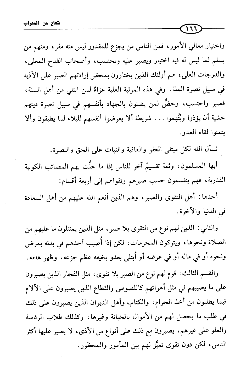 أيها المسلمون، وثمة تقسيمٌ آخر للناس إذا ما حلَّت بهم المصائب الكونية القدرية، فهم ينقسمون حسب صبرهم وتقواهم إلى أربعة أقسام: