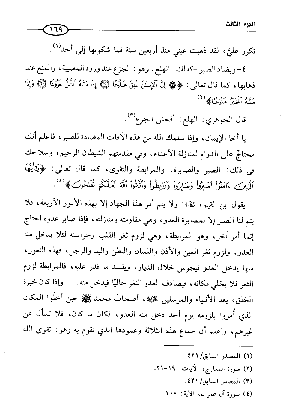 يقول ابن القيم، رحمه الله: ولا يتم أمر هذا الجهاد إلا بهذه الأمور الأربعة، فلا يتم لنا الصبر إلا بمصابرة العدو، وهي مقاومته ومنازلته، فإذا صابر عدوه احتاج إنما أمر آخر، وهو المرابطة، وهي لزوم ثغر القلب وحراسته لئلا يدخل منه العدو، ولزوم ثغر العين والأذن واللسان والبطن واليد والرجل، فهذه الثغور، منها يدخل العدو فيجوس خلال الديار، ويفسد ما قدر عليه، فالمرابطة لزوم الثغر فلا يخلي مكانه، فيصادف العدو الثغر خاليًا فيدخل منه ... وإذا كان خيرة الخلق، بعد الأنبياء والمرسلين عليهم السلام، أصحابُ محمد صلى الله عليه وسلم حين أخلَوا المكان الذي أُمروا بلزومه يوم أحد دخل منه العدو، فكان ما كان، فلا تسأل عن غيرهم، واعلم أن جماع هذه الثلاثة وعمودها الذي تقوم به وهو: تقوى الله