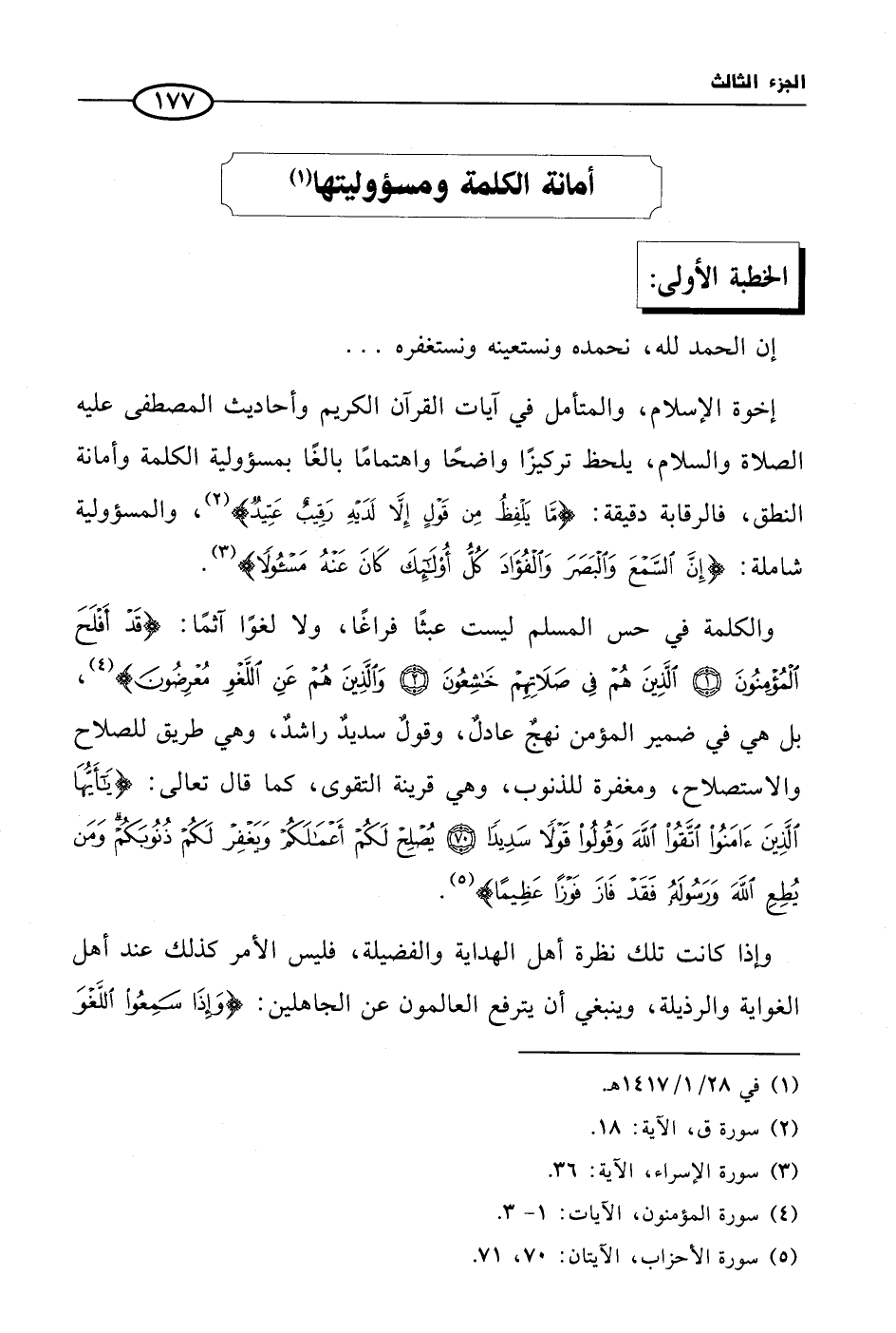 إخوة الإسلام، والمتأمل في آيات القرآن الكريم وأحاديث المصطفى عليه الصلاة والسلام، يلحظ تركيزًا واضحًا واهتمامًا بالغًا بمسؤولية الكلمة وأمانة النطق، فالرقابة دقيقة: {مَا يَلْفِظُ مِن قَوْلٍ إِلاَّ لَدَيْهِ رَقِيبٌ عَتِيدٌ} (¬2)، والمسؤولية شاملة: {إِنَّ السَّمْعَ وَالْبَصَرَ وَالْفُؤَادَ كُلُّ أُولئِكَ كَانَ عَنْهُ مَسْؤُولاً} (¬3).