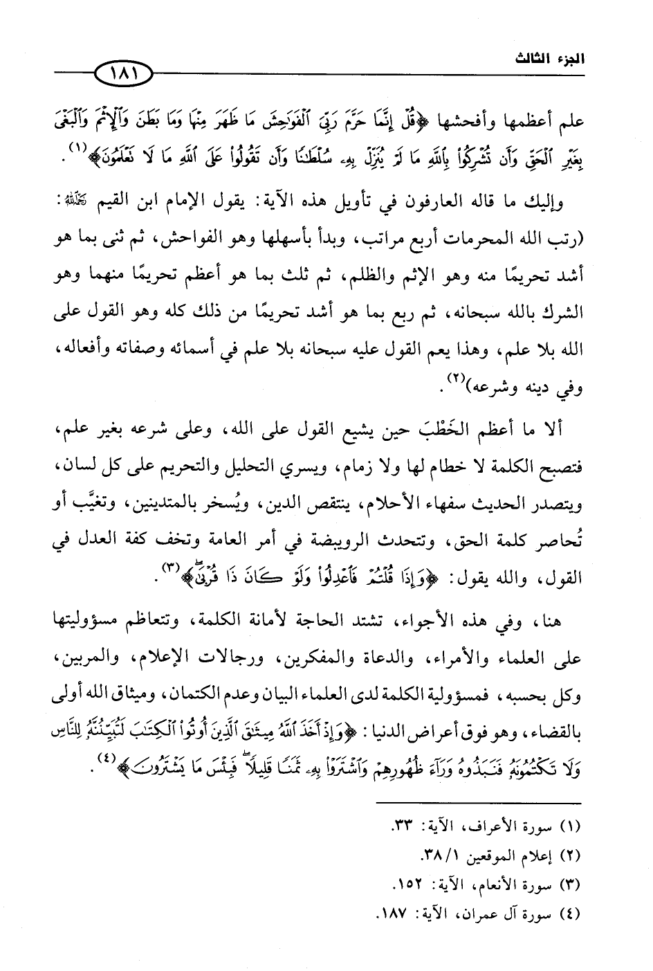 وإليك ما قاله العارفون في تأويل هذه الآية: يقول الإمام ابن القيم، رحمه الله: (رتب الله المحرمات أربع مراتب، وبدأ بأسهلها وهو الفواحش، ثم ثنى بما هو أشد تحريمًا منه وهو الإثم والظلم، ثم ثلث بما هو أعظم تحريمًا منهما وهو الشرك بالله سبحانه، ثم ربع بما هو أشد تحريمًا من ذلك كله وهو القول على الله بلا علم، وهذا يعم القول عليه سبحانه بلا علم في أسمائه وصفاته وأفعاله، وفي دينه وشرعه) (¬2).