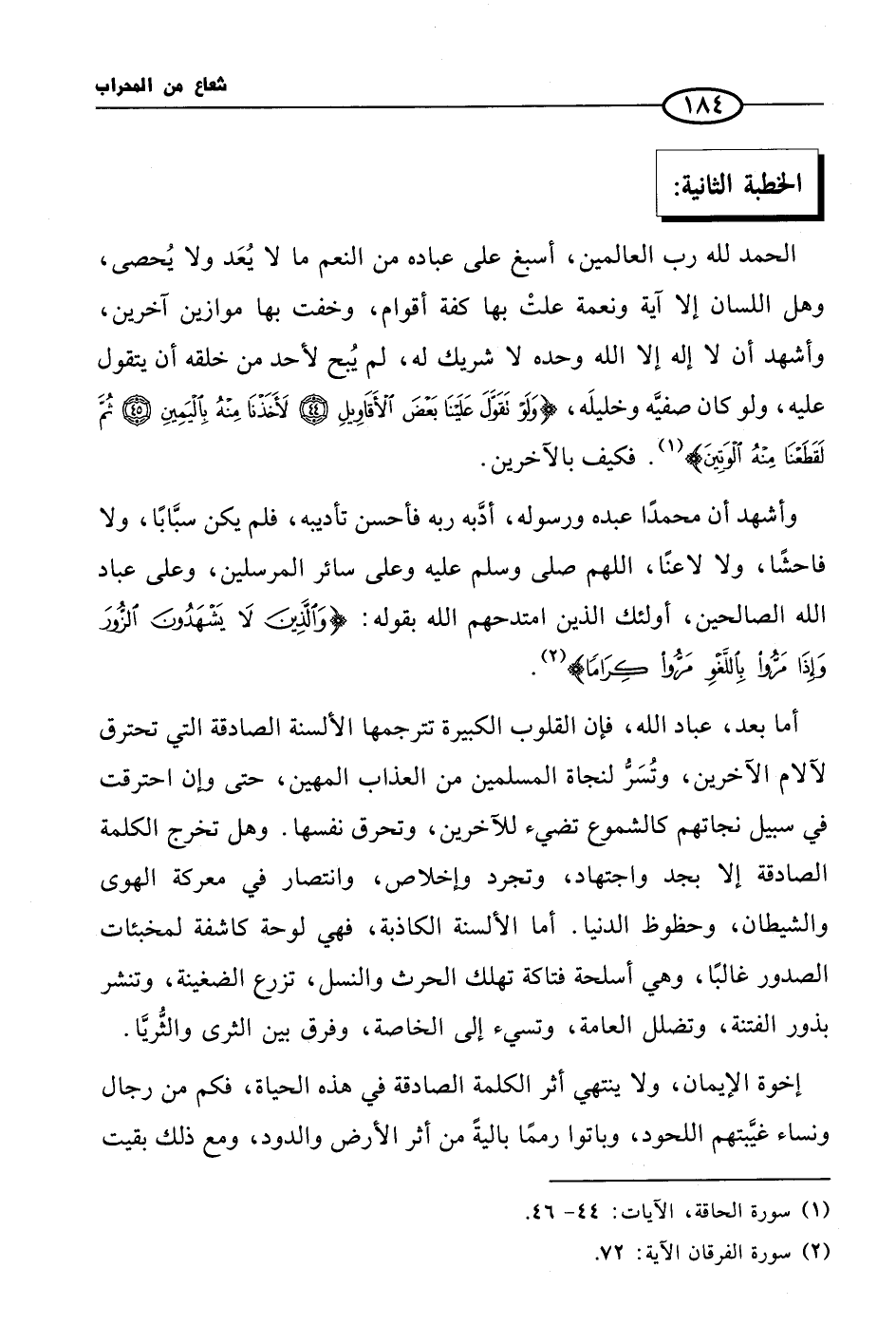 أما بعد، عباد الله، فإن القلوب الكبيرة تترجمها الألسنة الصادقة التي تحترق لآلام الآخرين، وتُسَرُّ لنجاة المسلمين من العذاب المهين، حتى وإن احترقت في سبيل نجاتهم كالشموع تضيء للآخرين، وتحرق نفسها. وهل تخرج الكلمة الصادقة إلا بجد واجتهاد، وتجرد وإخلاص، وانتصار في معركة الهوى والشيطان، وحظوظ الدنيا. أما الألسنة الكاذبة، فهي لوحة كاشفة لمخبئات الصدور غالبًا، وهي أسلحة فتاكة تهلك الحرث والنسل، تزرع الضغينة، وتنشر بذور الفتنة، وتضلل العامة، وتسيء إلى الخاصة، وفرق بين الثرى والثُّريَّا ...