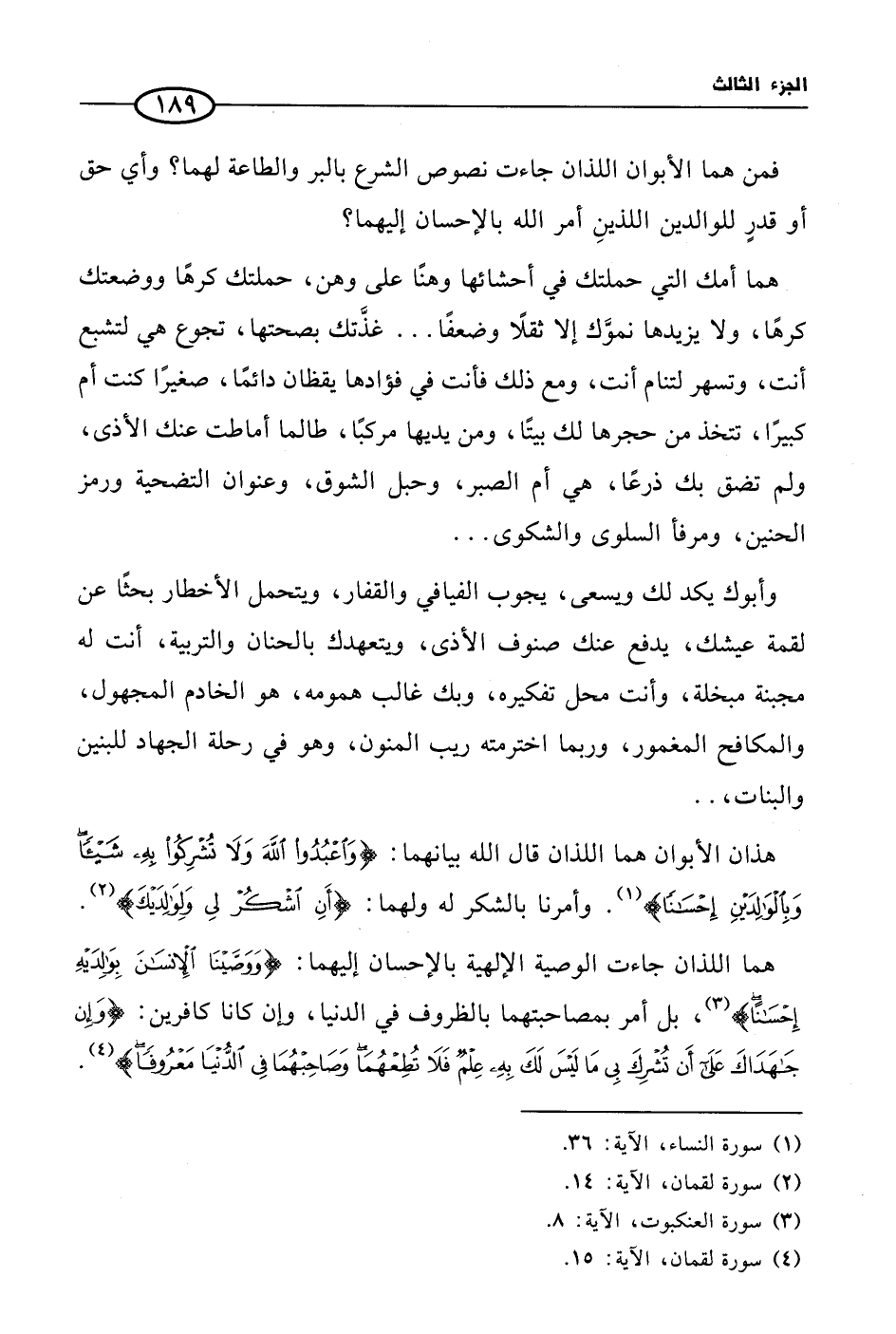هذان الأبوان هما اللذان قال الله بيانهما: {وَاعْبُدُوا اللَّهَ وَلاَ تُشْرِكُوا بِهِ شَيْئاً وَبِالْوَالِدَيْنِ إِحْسَاناً} (¬1). وأمرنا بالشكر له ولهما: {أَنِ اشْكُرْ لِي وَلِوَالِدَيْكَ} (¬2).
