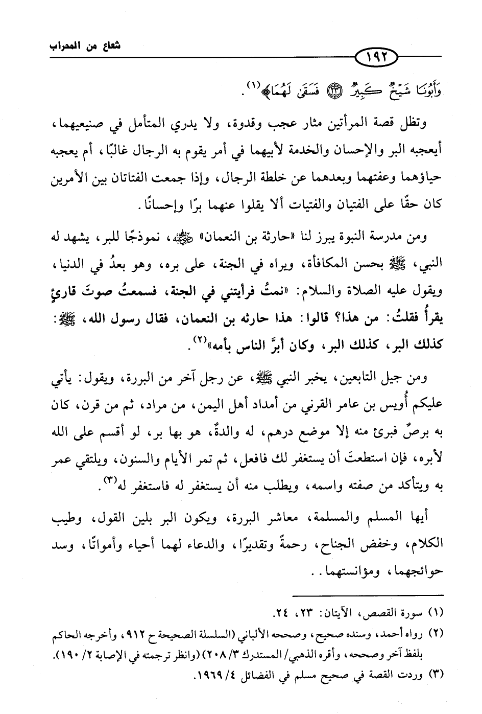 ومن مدرسة النبوة يبرز لنا «حارثة بن النعمان» رضي الله عنه، نموذجًا للبر، يشهد له النبي، صلى الله عليه وسلم بحسن المكافأة، ويراه في الجنة، على بره، وهو بعدُ في الدنيا، ويقول عليه الصلاة والسلام: «نمتُ فرأيتني في الجنة، فسمعتُ صوتَ قارئٍ يقرأُ فقلتُ: من هذا؟ قالوا: هذا حارثه بن النعمان، فقال رسول الله، صلى الله عليه وسلم: كذلك البر، كذلك البر، وكان أبرَّ الناس بأمه) (¬2).