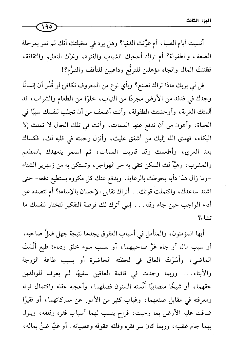 قل لي بربك ماذا تراك تصنع؟ وبأي نوع من المعروف تكافئ لو قُدِّر أن إنسانًا وجدك في فدفد من الأرض مجردًا من الثياب، خلوًا من الطعام والشراب، قد آلمتك الغربة، وأوحشتك الطفولة، وأنت أضعف من أن تجلب لنفسك سببًا في الحياة، وأهون من أن تدفع عنها الممات، وأنت في تلك الحال لا تملك إلا البكاء، فهدى الله إليك من أشفق عليك، وأنزل رحمته في قلبه لك، فكساك بعد العري، وأطعمك وقد قاربت الممات، ثم استمر يتعهدك بالمطعم والمشرب، وهيَّأ لك السكن تتقي به حر الهواجر، وتستكن به من زمهرير الشتاء- وما زال هذا دأبه يحوطك بالرعاية، ويدفع عنك كل مكروه يستطيع دفعه- حتى اشتد ساعدك، واكتملت قوتك .. أتراك تقابل الإحسان بالإساءة؟ أم تتصدد عن أداء الواجب حين جاء وقته ... إنني أترك لك فرصة التفكير لتختار لنفسك ما تشاء؟