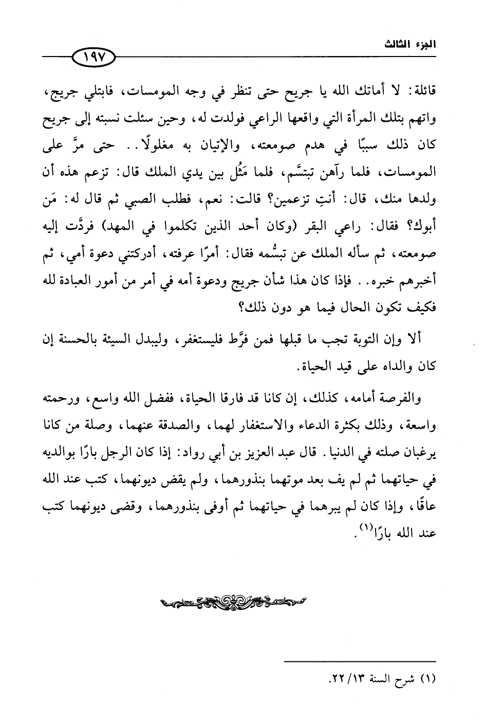 قائلة: لا أماتك الله يا جريح حتى تنظر في وجه المومسات، فابتلي جريج، واتهم بتلك المرأة التي واقعها الراعي فولدت له، وحين سئلت نسبته إلى جريح كان ذلك سببًا في هدم صومعته، والإتيان به مغلولاً .. حتى مرَّ على المومسات، فلما رآهن تبتسَّم، فلما مَثُل بين يدي الملك قال: تزعم هذه أن ولدها منك، قال: أنتِ تزعمين؟ قالت: نعم، فطلب الصبي ثم قال له: مَن أبوك؟ فقال: راعي البقر (وكان أحد الذين تكلموا في المهد) فردَّت إليه صومعته، ثم سأله الملك عن تبسُّمه فقال: أمرًا عرفته، أدركتني دعوة أمي، ثم أخبرهم خبره .. فإذا كان هذا شأن جريج ودعوة أمه في أمر من أمور العبادة لله فكيف تكون الحال فيما هو دون ذلك؟