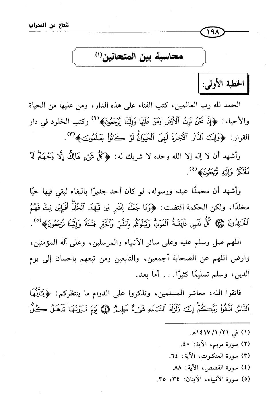 الحمد لله رب العالمين، كتب الفناء على هذه الدار، ومن عليها من الحياة والأحياء: {إِنَّا نَحْنُ نَرِثُ الأَرْضَ وَمَنْ عَلَيْهَا وَإِلَيْنَا يُرْجَعُونَ} (¬2) وكتب الخلود في دار القرار: {وَإِنَّ الدَّارَ الآخِرَةَ لَهِيَ الْحَيَوَانُ لَوْ كَانُوا يَعْلَمُونَ} (¬3).