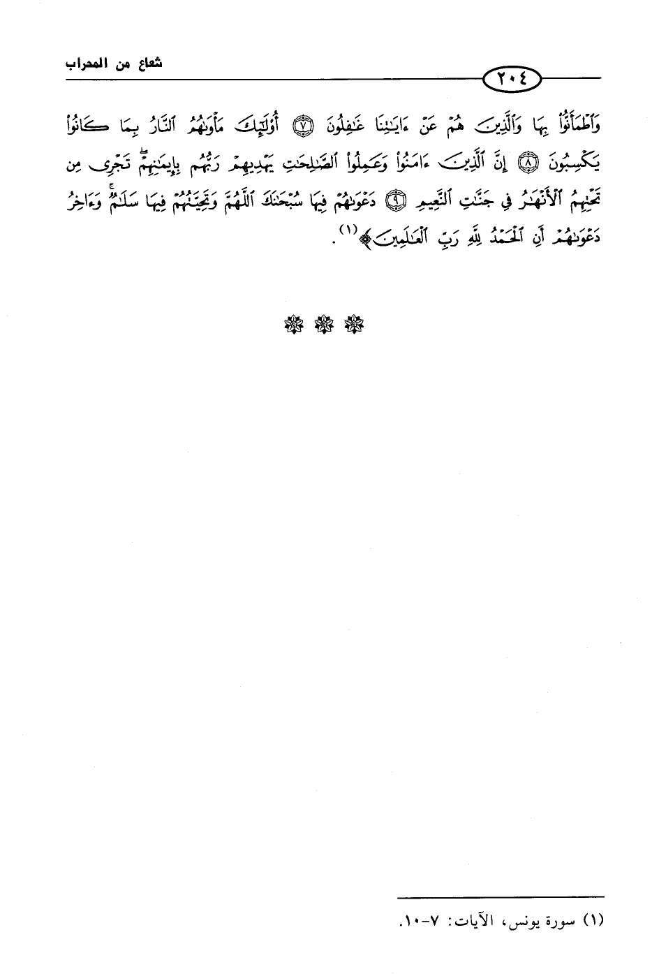 وَاطْمَأَنُّوا بِهَا وَالَّذِينَ هُمْ عَنْ آيَاتِنَا غَافِلُونَ (7) أُوْلَئِكَ مَأْوَاهُمُ النُّارُ بِمَا كَانُوا يَكْسِبُونَ (8) إِنَّ الَّذِينَ آمَنُوا وَعَمِلُوا الصَّالِحَاتِ يَهْدِيهِمْ رَبُّهُمْ بِإِيمَانِهِمْ تَجْرِي مِن تَحْتِهِمُ الأَنْهَارُ فِي جَنَّاتِ النَّعِيمِ (9) دَعْوَاهُمْ فِيهَا سُبْحَانَكَ اللَّهُمَّ وَتَحِيَّتُهُمْ فِيهَا سَلاَمٌ وَآخِرُ دَعْوَاهُمْ أَنِ الْحَمْدُ لِلّهِ رَبِّ الْعَالَمِينَ} (¬1).