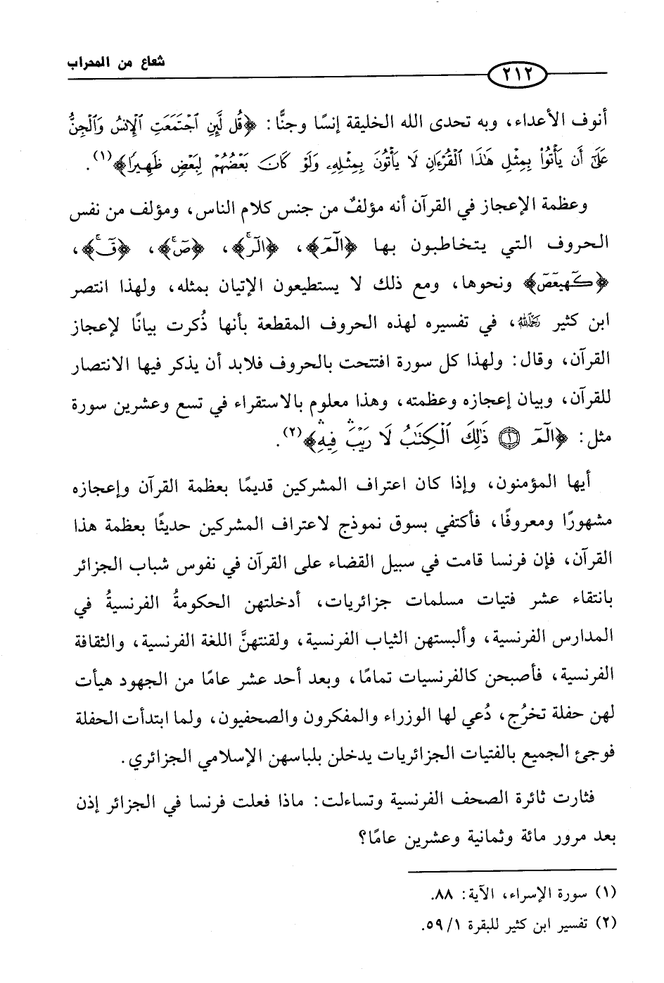 أيها المؤمنون، وإذا كان اعتراف المشركين قديمًا بعظمة القرآن وإعجازه مشهورًا ومعروفًا، فأكتفي بسوق نموذج لاعتراف المشركين حديثًا بعظمة هذا القرآن، فإن فرنسا قامت في سبيل القضاء على القرآن في نفوس شباب الجزائر بانتقاء عشر فتيات مسلمات جزائريات، أدخلتهن الحكومةُ الفرنسيةُ في المدارس الفرنسية، وألبستهن الثياب الفرنسية، ولقنتهنَّ اللغة الفرنسية، والثقافة الفرنسية، فأصبحن كالفرنسيات تمامًا، وبعد أحد عشر عامًا من الجهود هيأت لها حفلة تخرُج، دُعي لها الوزراء والمفكرون والصحفيون، ولما ابتدأت الحفلة فوجئ الجميع بالفتيات الجزائريات يدخلن بلباسهن الإسلامي الجزائري ..
