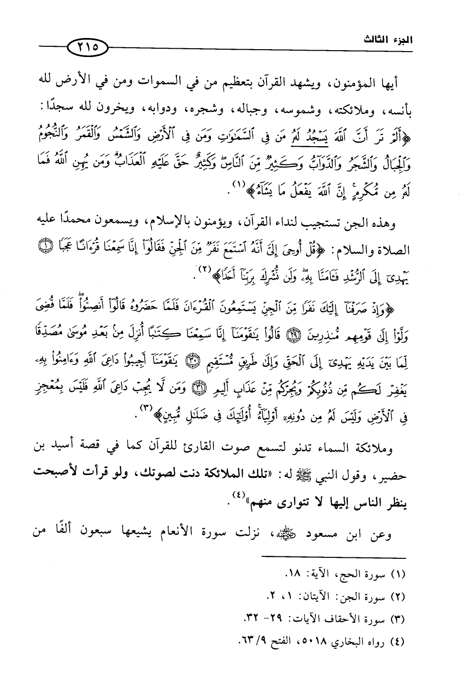 وهذه الجن تستجيب لنداء القرآن، ويؤمنون بالإسلام، ويسمعون محمدًا عليه الصلاة والسلام: {قُلْ أُوحِيَ إِلَيَّ أَنَّهُ اسْتَمَعَ نَفَرٌ مِّنَ الْجِنِّ فَقَالُوا إِنَّا سَمِعْنَا قُرْآناً عَجَباً (1) يَهْدِي إِلَى الرُّشْدِ فَآمَنَّا بِهِ وَلَن نُّشْرِكَ بِرَبِّنَا أَحَداً} (¬2).