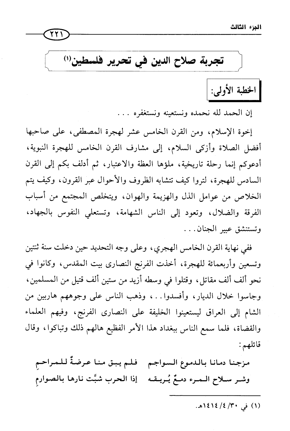 إخوة الإسلام، ومن القرن الخامس عشر لهجرة المصطفى، على صاحبها أفضل الصلاة وأزكى السلام، إلى مشارف القرن الخامس للهجرة النبوية، أدعوكم إنما رحلة تاريخية، ملؤها العظة والاعتبار، ثم أدلف بكم إلى القرن السادس للهجرة، لتروا كيف تتشابه الظروف والأحوال عبر القرون، وكيف يتم الخلاص من عوامل الذل والهزيمة والهوان، ويتخلص المجتمع من أسباب الفرقة والضلال، وتعود إلى الناس الشهامة، وتستعلي النفوس بالجهاد، وتستنشق عبير الجنان ...