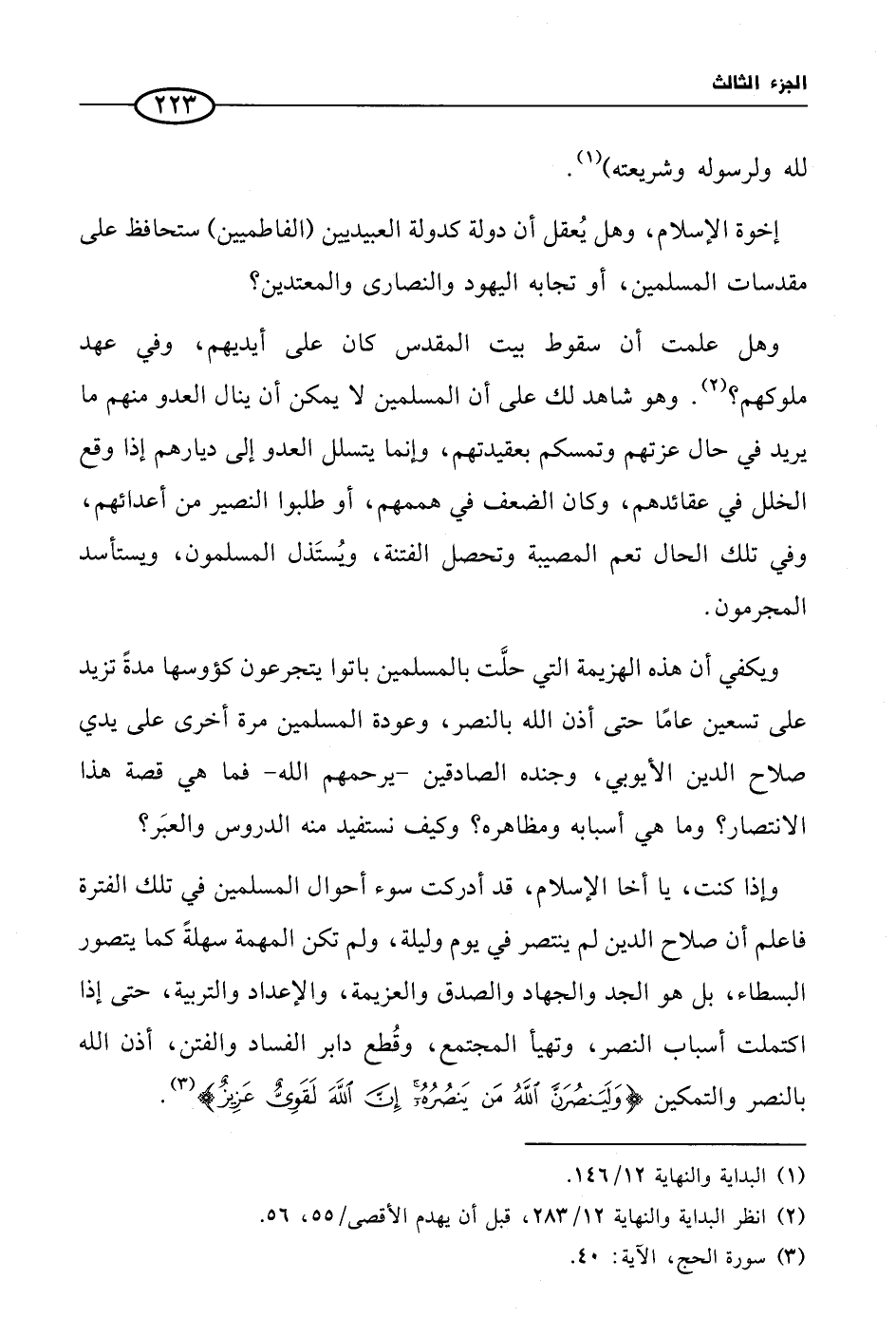 وهل علمت أن سقوط بيت المقدس كان على أيديهم، وفي عهد ملوكهم؟ (¬2). وهو شاهد لك على أن المسلمين لا يمكن أن ينال العدو منهم ما يريد في حال عزتهم وتمسكم بعقيدتهم، وإنما يتسلل العدو إلى ديارهم إذا وقع الخلل في عقائدهم، وكان الضعف في هممهم، أو طلبوا النصير من أعدائهم، وفي تلك الحال تعم المصيبة وتحصل الفتنة، ويُستَذل المسلمون، ويستأسد المجرمون.