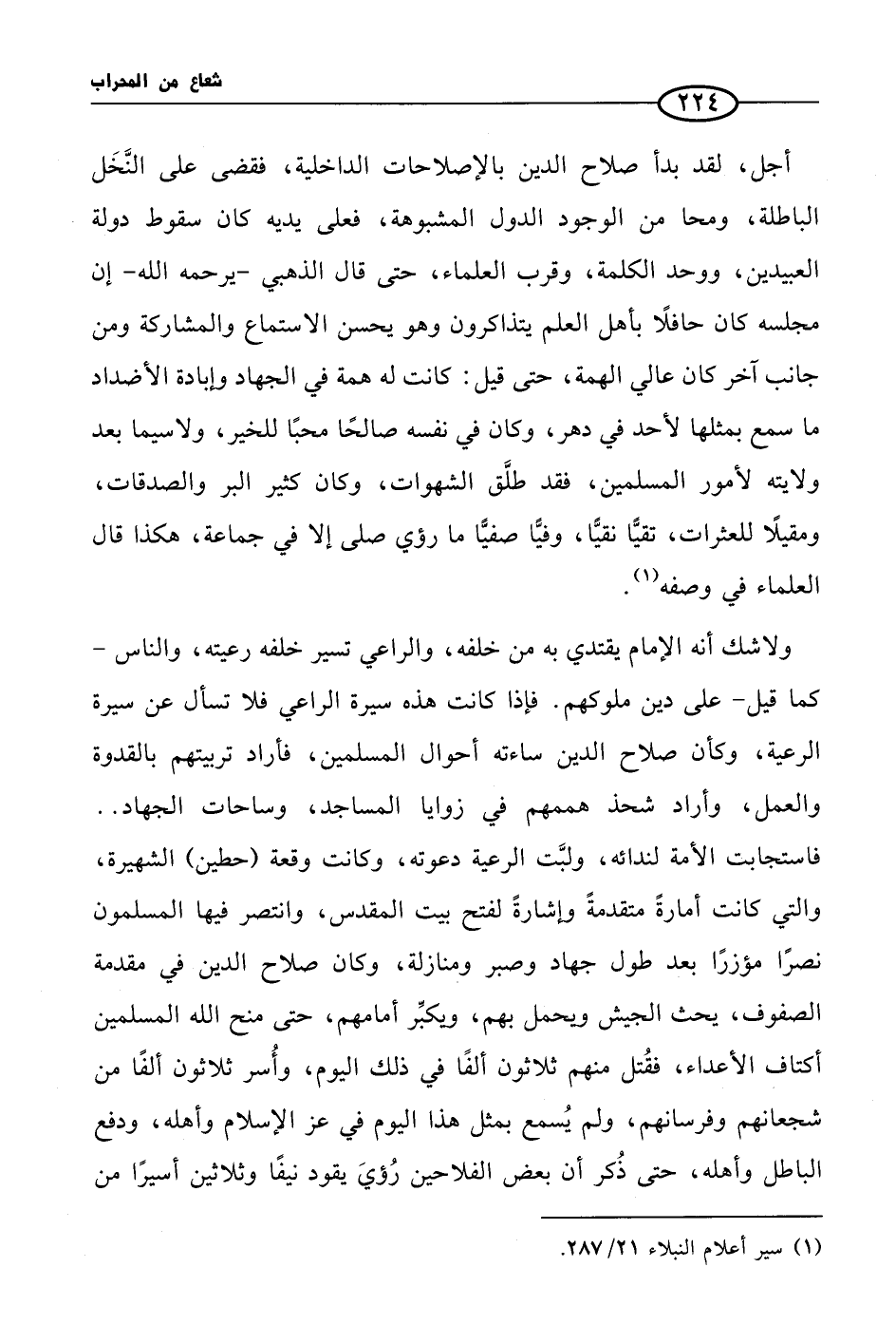 أجل، لقد بدأ صلاح الدين بالإصلاحات الداخلية، فقضى على النَّخَل الباطلة، ومحا من الوجود الدول المشبوهة، فعلى يديه كان سقوط دولة العبيدين، ووحد الكلمة، وقرب العلماء، حتى قال الذهبي- يرحمه الله- إن مجلسه كان حافلاً بأهل العلم يتذاكرون وهو يحسن الاستماع والمشاركة ومن جانب آخر كان عالي الهمة، حتى قيل: كانت له همة في الجهاد وإبادة الأضداد ما سمع بمثلها لأحد في دهر، وكان في نفسه صالحًا محبًا للخير، ولاسيما بعد ولايته لأمور المسلمين، فقد طلَّق الشهوات، وكان كثير البر والصدقات، ومقيلاً للعثرات، تقيًّا نقيًّا، وفيًّا صفيًّا ما رؤي صلى إلا في جماعة، هكذا قال العلماء في وصفه (¬1).