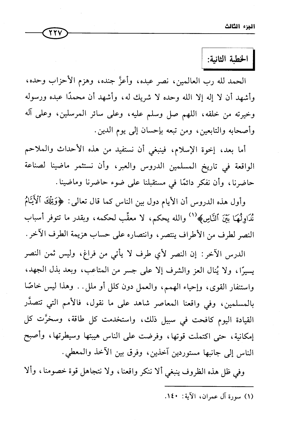 أما بعد، إخوة الإسلام، فينبغي أن نستفيد من هذه الأحداث والملاحم الواقعة في تاريخ المسلمين الدروس والعبر، وأن نستثمر ماضينا لصناعة حاضرنا، وأن نفكر دائمًا في مستقبلنا على ضوء حاضرنا وماضينا.