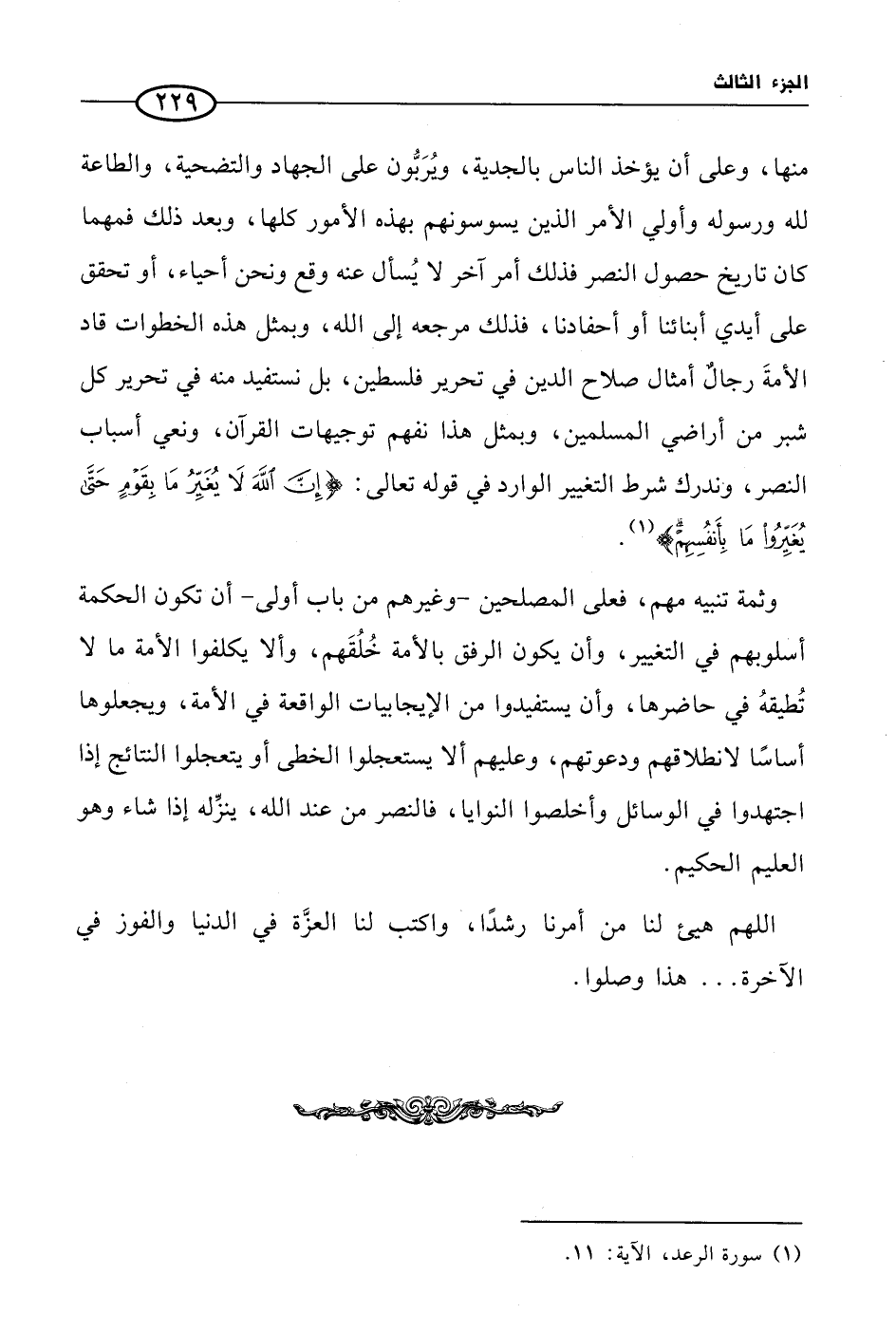 منها، وعلى أن يؤخذ الناس بالجدية، ويُرَبُّون على الجهاد والتضحية، والطاعة لله ورسوله وأولي الأمر الذين يسوسونهم بهذه الأمور كلها، وبعد ذلك فمهما كان تاريخ حصول النصر فذلك أمر آخر لا يُسأل عنه وقع ونحن أحياء، أو تحقق على أيدي أبنائنا أو أحفادنا، فذلك مرجعه إلى الله، وبمثل هذه الخطوات قاد الأمةَ رجالٌ أمثال صلاح الدين في تحرير فلسطين، بل نستفيد منه في تحرير كل شبر من أراضي المسلمين، وبمثل هذا نفهم توجيهات القرآن، ونعي أسباب النصر، وندرك شرط التغيير الوارد في قوله تعالى: {إِنَّ اللَّهَ لاَ يُغَيِّرُ مَا بِقَوْمٍ حَتَّى يُغَيِّرُوا مَا بِأَنْفُسِهِمْ} (¬1).