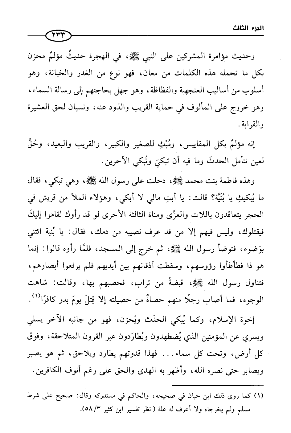 وحديث مؤامرة المشركين على النبي، صلى الله عليه وسلم، في الهجرة حديثٌ مؤلمٌ محزن بكل ما تحمله هذه الكلمات من معان، فهو نوع من الغدر والخيانة، وهو أسلوب من أساليب العنجهية والفظاظة، وهو جهل بحاجتهم إلى رسالة السماء، وهو خروج على المألوف في حماية القريب والذود عنه، ونسيان لحق العشيرة والقرابة.
