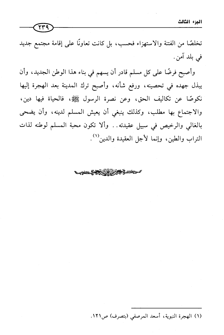 وأصبح فرضًا على كل مسلم قادر أن يسهم في بناء هذا الوطن الجديد، وأن يبذل جهده في تحصينه، ورفع شأنه، وأصبح ترك المدينة بعد الهجرة إليها نكوصًا عن تكاليف الحق، وعن نصرة الرسول، صلى الله عليه وسلم، فالحياة فيها دين، والاجتماع بها مطلب، وكذلك ينبغي أن يعيش المسلم لدينه، وأن يضحى بالغالي والرخيص في سبيل عقيدته .. وألا تكون محبة المسلم لوطنه لذات التراب والطين، وإنما لأجل العقيدة والدين (¬1).