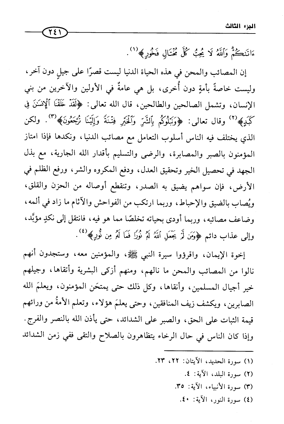 إن المصائب والمحن في هذه الحياة الدنيا ليست قصرًا على جيلٍ دون آخر، وليست خاصةً بأمةٍ دون أُخرى، بل هي عامةٌ في الأولين والآخرين من بني الإنسان، وتشمل الصالحين والطالحين، قال الله تعالى: {لَقَدْ خَلَقْنَا الإِنسَانَ فِي كَبَدٍ} (¬2) وقال تعالى: {وَنَبْلُوكُم بِالشَّرِّ وَالْخَيْرِ فِتْنَةً وَإِلَيْنَا تُرْجَعُونَ} (¬3). ولكن الذي يختلف فيه الناس أسلوب التعامل مع مصائب الدنيا، ونكدها فإذا امتاز المؤمنون بالصبر والمصابرة، والرضى والتسليم بأقدار الله الجارية، مع بذل الجهد في تحصيل الخير وتحقيق العدل، ودفع المكروه والشر، ورفع الظلم في الأرض، فإن سواهم يضيق به الصدر، وتنقطع أوصاله من الحزن والقلق، ويُصاب بالضيق والإحباط، وربما ارتكب من الفواحش والآثام ما زاد في ألمه، وضاعف مصائبه، وربما أودى بحياته تخلصًا مما هو فيه، فانتقل إلى نكدٍ مؤبَّد، وإنما عذاب دائم {وَمَن لَّمْ يَجْعَلِ اللَّهُ لَهُ نُوراً فَمَا لَهُ مِن نُّورٍ} (¬4).