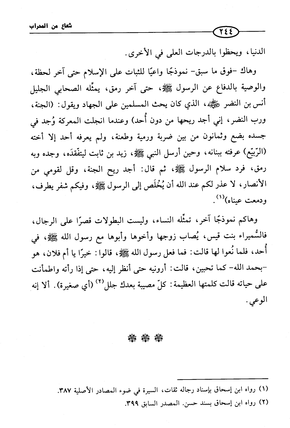 وهاك- فوق ما سبق- نموذجًا واعيًا للثبات على الإسلام حتى آخر لحظة، والوصية بالدفاع عن الرسول، صلى الله عليه وسلم، حتى آخر رمق، يمثِّله الصحابي الجليل أنس بن النضر، رضي الله عنه، الذي كان يحث المسلمين على الجهاد ويقول: (الجنة، ورب النضر، إني أجد ريحها من دون أُحد) وعندما انجلت المعركة وُجد في جسده بضع وثمانون من بين ضربة ورمية وطعنة، ولم يعرفه أحد إلا أخته (الرّبيّع) عرفته ببنانه، وحين أرسل النبي، صلى الله عليه وسلم، زيد بن ثابت ليتفّقدَه، وجده وبه رمق، فرد سلام الرسول، صلى الله عليه وسلم، ثم قال: أجد ريح الجنة، وقل لقومي من الأنصار، لا عذر لكم عند الله أن يُخْلَص إلى الرسول، صلى الله عليه وسلم، وفيكم شفر يطرف، ودمعت عيناه) (¬1).