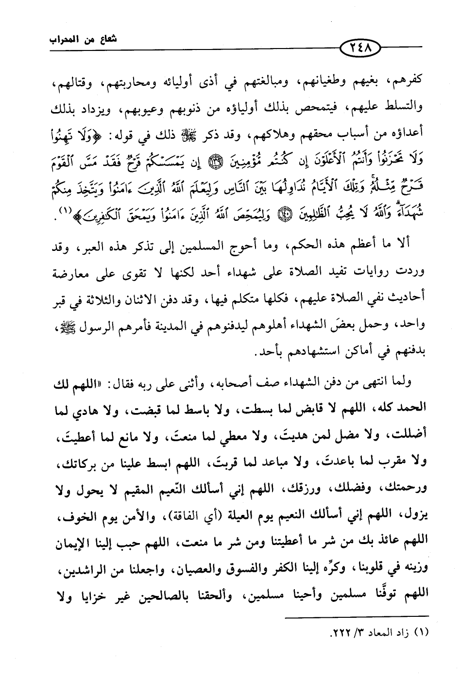 ألا ما أعظم هذه الحكم، وما أحوج المسلمين إلى تذكر هذه العبر، وقد وردت روايات تفيد الصلاة على شهداء أحد لكنها لا تقوى على معارضة أحاديث نفي الصلاة عليهم، فكلها متكلم فيها، وقد دفق الاثنان والثلاثة في قبر واحد، وحمل بعضَ الشهداء أهلوهم ليدفنوهم في المدينة فأمرهم الرسول، صلى الله عليه وسلم، بدفنهم في أماكن استشهادهم بأحد.