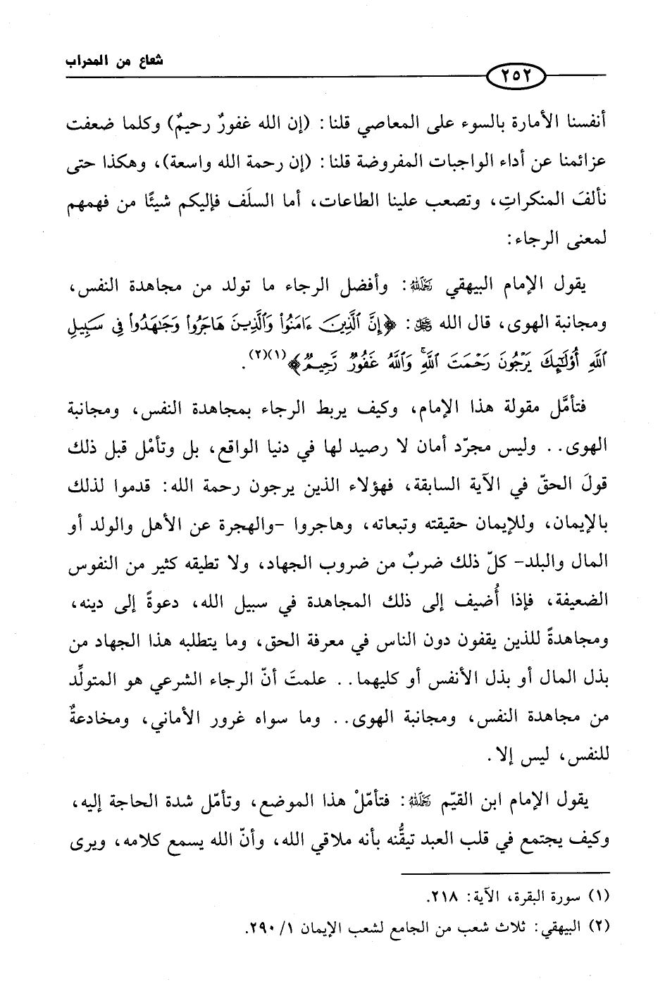 فتأمَّل مقولة هذا الإمام، وكيف يربط الرجاء بمجاهدة النفس، ومجانبة الهوى .. وليس مجرّد أمان لا رصيد لها في دنيا الواقع، بل وتأمْل قبل ذلك قولَ الحقّ في الآية السابقة، فهؤلاء الذين يرجون رحمة الله: قدموا لذلك بالإيمان، وللإيمان حقيقته وتبعاته، وهاجروا- والهجرة عن الأهل والولد أو المال والبلد- كلّ ذلك ضربٌ من ضروب الجهاد، ولا تطيقه كثير من النفوس الضعيفة، فإذا أُضيف إلى ذلك المجاهدة في سبيل الله، دعوةً إلى دينه، ومجاهدةً للذين يقفون دون الناس في معرفة الحق، وما يتطلبه هذا الجهاد من بذل المال أو بذل الأنفس أو كليهما .. علمتَ أنّ الرجاء الشرعي هو المتولِّد من مجاهدة النفس، ومجانبة الهوى .. وما سواه غرور الأماني، ومخادعةٌ للنفس، ليس إلا.