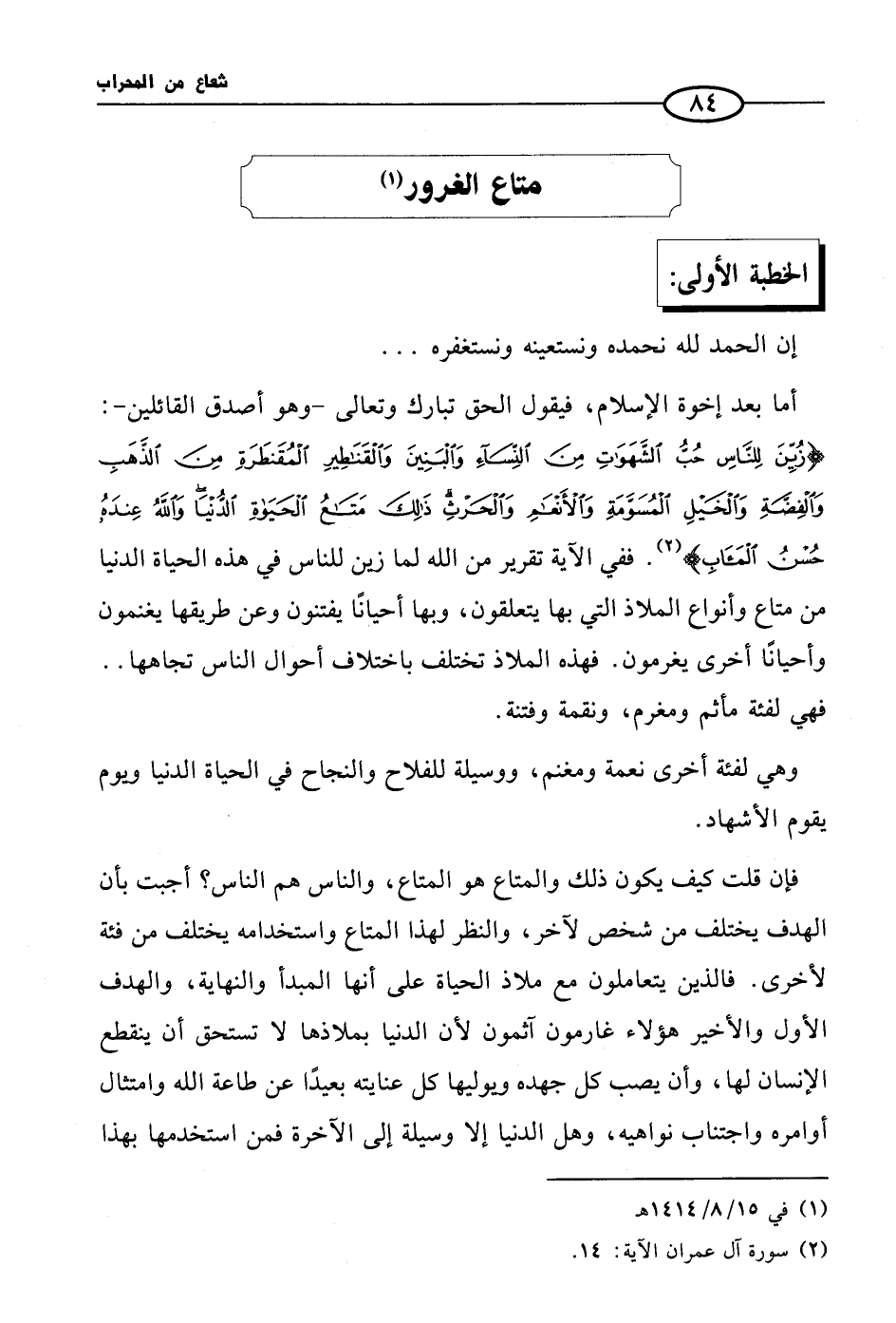 أما بعد إخوة الإسلام، فيقول الحق تبارك وتعالى- وهو أصدق القائلين-: {زُيِّنَ لِلنَّاسِ حُبُّ الشَّهَوَاتِ مِنَ النِّسَاءِ وَالْبَنِينَ وَالْقَنَاطِيرِ الْمُقَنطَرَةِ مِنَ الذَّهَبِ وَالْفِضَّةِ وَالْخَيْلِ الْمُسَوَّمَةِ وَالأَنْعَامِ وَالْحَرْثِ ذَلِكَ مَتَاعُ الْحَيَاةِ الدُّنْيَا وَاللَّهُ عِندَهُ حُسْنُ الْمَآبِ} (¬2). ففي الآية تقرير من الله لما زين للناس في هذه الحياة الدنيا من متاع وأنواع الملاذ التي بها يتعلقون، وبها أحيانًا يفتنون وعن طريقها يغنمون وأحيانًا أخرى يغرمون. فهذه الملاذ تختلف باختلاف أحوال الناس تجاهها .. فهي لفئة مأثم ومغرم، ونقمة وفتنة.
