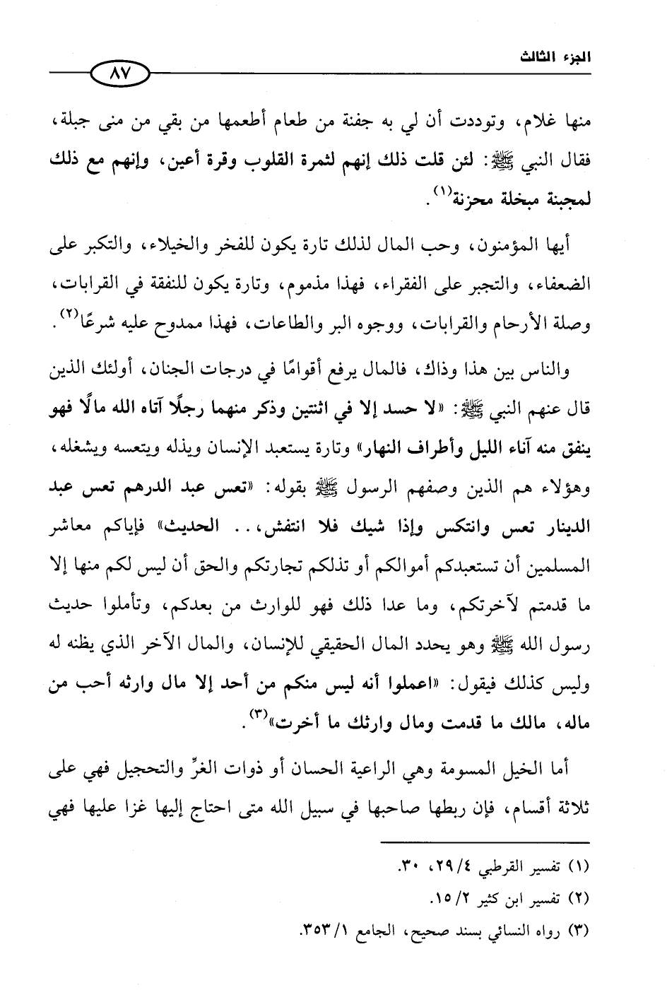 أيها المؤمنون، وحب المال لذلك تارة يكون للفخر والخيلاء، والتكبر على الضعفاء، والتجبر على الفقراء، فهذا مذموم، وتارة يكون للنفقة في القرابات، وصلة الأرحام والقرابات، ووجوه البر والطاعات، فهذا ممدوح عليه شرعًا (¬2).
