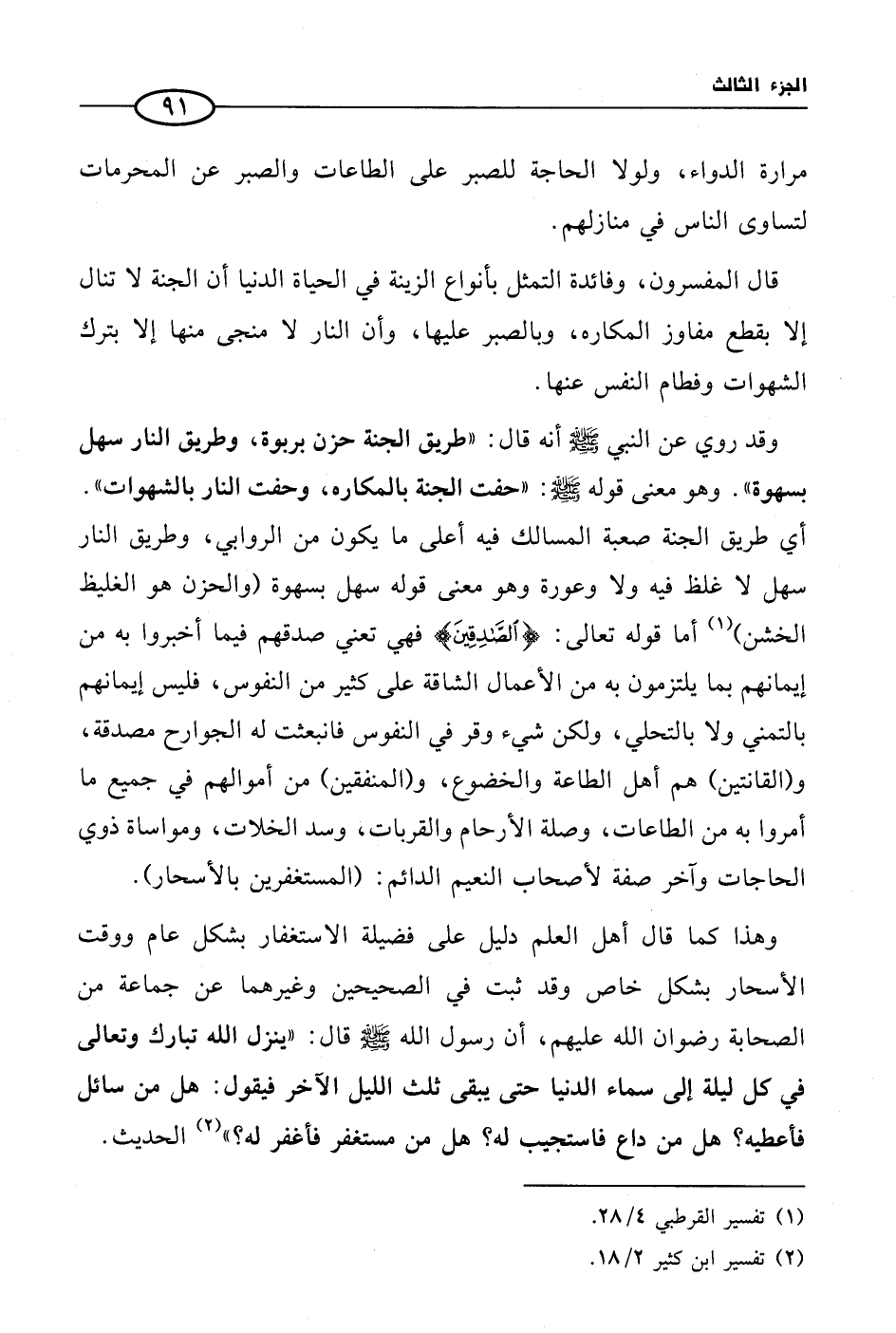 وقد روي عن النبي صلى الله عليه وسلم أنه قال: «طريق الجنة حزن بربوة، وطريق النار سهل بسهوة». وهو معنى قوله صلى الله عليه وسلم: «حفت الجنة بالمكاره، وحفت النار بالشهوات». أي طريق الجنة صعبة المسالك فيه أعلى ما يكون من الروابي، وطريق النار سهل لا غلظ فيه ولا وعورة وهو معنى قوله سهل بسهوة (والحزن هو الغليظ الخشن) (¬1) أما قوله تعالى (الصادقين) فهي تعني صدقهم فيما أخبروا به من إيمانهم بما يلتزمون به من الأعمال الشاقة على كثير من النفوس، فليس إيمانهم بالتمني ولا بالتحلي، ولكن شيء وقر في النفوس فانبعثت له الجوارح مصدقة، و (القانتين) هم أهل الطاعة والخضوع، و (المنفقين) من أموالهم في جميع ما أمروا به من الطاعات، وصلة الأرحام والقربات، وسد الخلات، ومواساة ذوي الحاجات وآخر صفة لأصحاب النعيم الدائم: (المستغفرين بالأسحار).