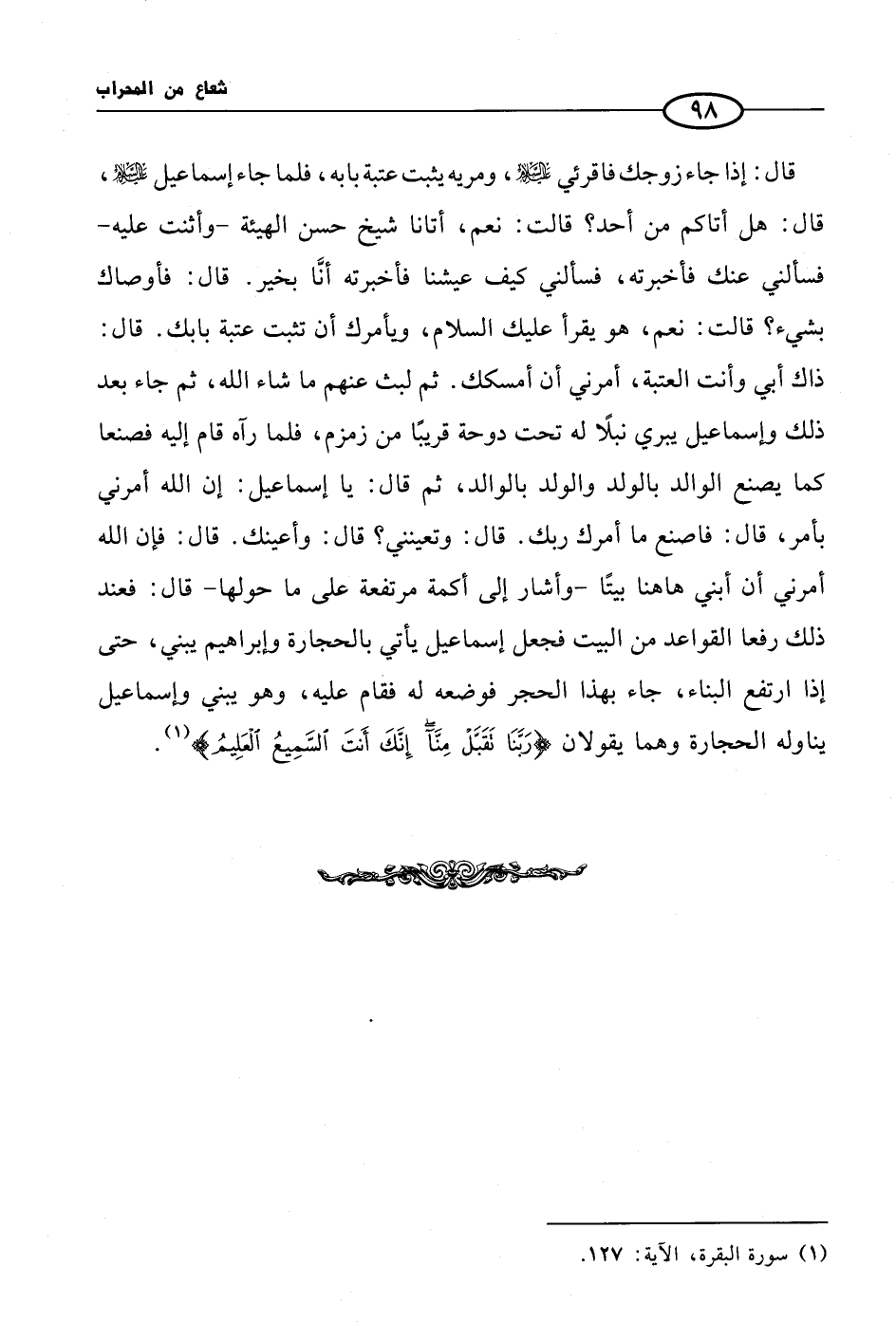 قال: إذا جاء زوجك فاقرئي عليه السلام، ومريه يثبت عتبة بابه، فلما جاء إسماعيل عليه السلام، قال: هل أتاكم من أحد؟ قالت: نعم، أتانا شيخ حسن الهيئة- وأثنت عليه- فسألني عنك فأخبرته، فسألني كيف عيشنا فأخبرته أنا بخير. قال: فأوصاك بشيء؟ قالت: نعم، هو يقرأ عليك السلام، ويأمرك أن تثبيت عتبة بابك. قال: ذاك أبي وأنت العتبة، أمرني أن أمسكك. ثم لبث عنهم ما شاء الله، ثم جاء بعد ذلك وإسماعيل يبري نبلاً له تحت دوحة قريبًا من زمزم، فلما رآه قام إليه فصنعا كما يصنع الوالد بالولد والولد بالوالد، ثم قال: يا إسماعيل: إن الله أمرني بأمر، قال: فاصنع ما أمرك ربك. قال: وتعينني؟ قال: وأعينك. قال: فإن الله أمرني أن أبني هاهنا بيتًا- وأشار إلى أكمة مرتفعة على ما حولها- قال: فعند ذلك رفعا القواعد من البيت فجعل إسماعيل يأتي بالحجارة وإبراهيم يبني، حتى إذا ارتفع البناء، جاء بهذا الحجر فوضعه له فقال عليه، وهو يبني وإسماعيل يناوله الحجارة وهما يقولان {رَبَّنَا تَقَبَّلْ مِنَّا إِنَّكَ أَنتَ السَّمِيعُ الْعَلِيمُ} (¬1).