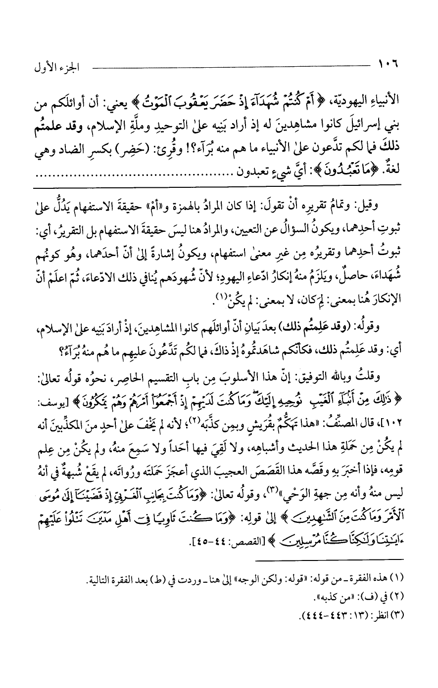 الأنبياء اليهودية، (أَمْ كُنتُمْ شُهَدَاءَ إِذْ حَضَرَ يَعْقُوبَ الْمَوْتُ) يعني: أن أوائلكم من بني إسرائيل كانوا مشاهدين له إذ أراد بنيه على التوحيد وملة الإسلام، وقد علمتم ذلك فما لكم تدعون على الأنبياء ما هم منه برآء؟ ! وقرئ: (حضر) بكسر الضاد وهي لغة. (مَا تَعْبُدُونَ): أي شيء تعبدون