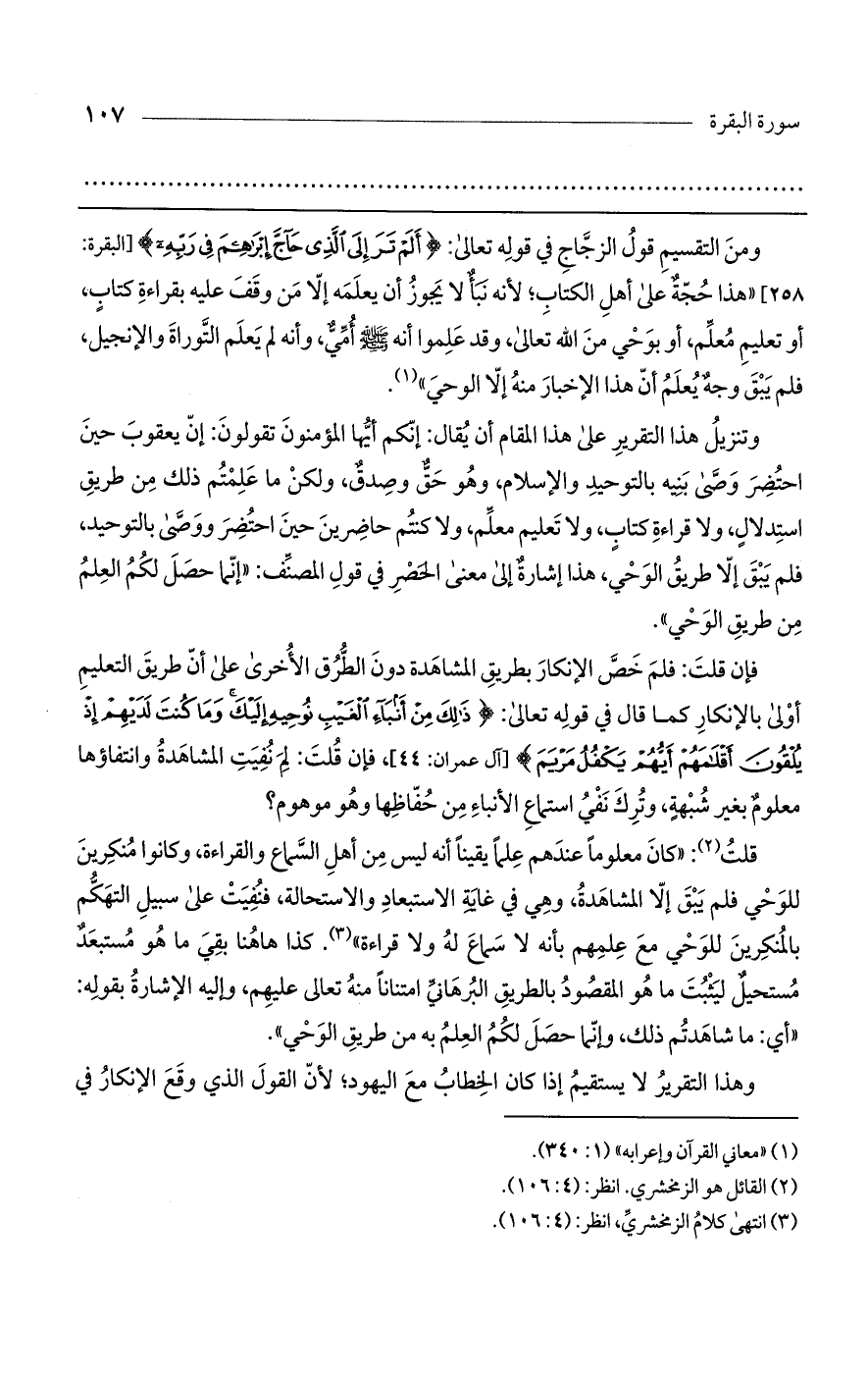 ومن التقسيم قول الزجاج في قوله تعالى: (أَلَمْ تَرَ إِلَى الَّذِي حَاجَّ إِبْرَاهِيمَ فِي رَبِّهِ) [البقرة: 258] "هذا حجة على أهل الكتاب؛ لأنه نبأ لا يجوز أن يعلمه إلا من وقف عليه بقراءة كتاب، أو تعليم معلم، أو بوحي من الله تعالى، وقد علموا أنه صلى الله عليه وسلم أمي، وأنه لم يعلم التوراة والإنجيل، فلم يبق وجه يعلم أن هذا الإخبار منه إلا الوحي".