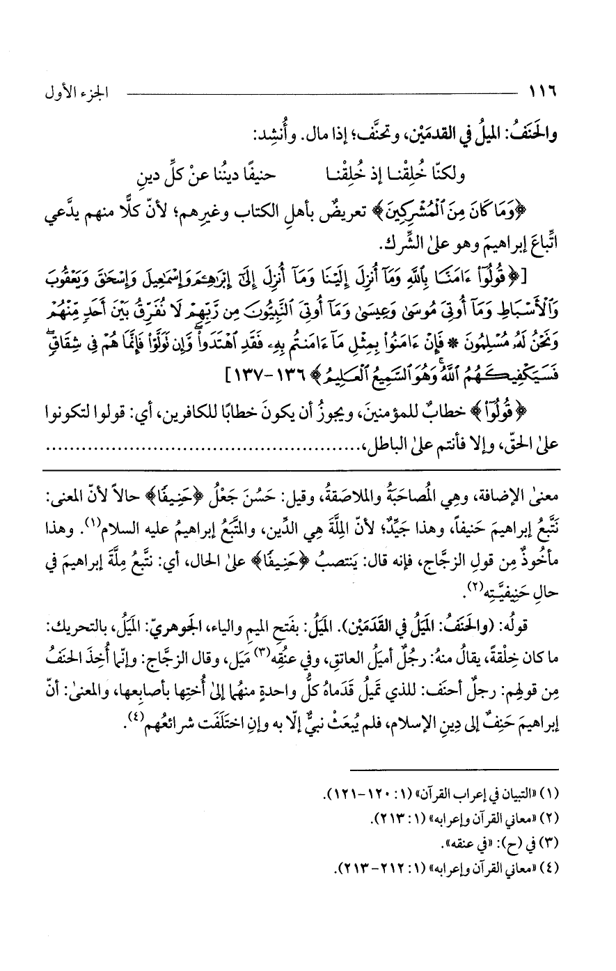 معنى الإضافة، وهي المصاحبة والملاصقة، وقيل: حسن جعل (حَنِيفاً) حالاً لأن المعنى: نتبع إبراهيم حنيفاً، وهذا جيد؛ لأن الملة هي الدين، والمتبع إبراهيم عليه السلام. وهذا مأخوذ من قول الزجاج، فإنه قال: ينتصب (حَنِيفاً) على الحال، أي: نتبع ملة إبراهيم في حال حنيفيته.