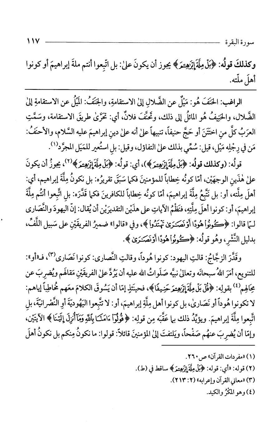 وقدر الزجاج: قالت اليهود: كونوا هوداً، وقالت النصارى: كونوا نصارى، فـ "أو": للتنويع، أمر الله سبحانه وتعالى نبيه صلوات الله عليه أن يرد على الفريقين مقالهم ويضرب عن محالهم بقوله: (قُلْ بَلْ مِلَّةَ إِبْرَاهِيمَ حَنِيفاً)، فحينئذ إما أن يسوق الكلام معهم مخاطباً إياهم: لا تكونوا هوداً أو نصارى، بل كونوا أهل ملة إبراهيم، أو: لا تتبعوا اليهودية والنصرانية، بل اتبعوا ملة إبراهيم. ويؤيد ذلك بما عقبه من قوله: (قُولُوا آمَنَّا بِاللَّهِ وَمَا أُنزِلَ إِلَيْنَا) الآيتين، وإما أن يضرب عنهم صفحاً، ويلتفت إلى المؤمنين قائلاً: قولوا: ما نكون منكم بل نكون أهل
