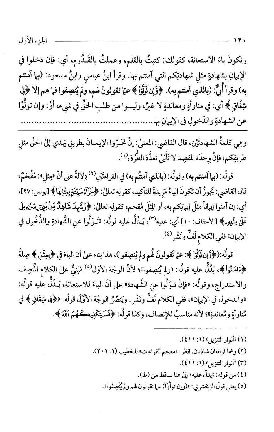قوله: ((وَإِنْ تَوَلَّوْا): عما تقولون لهم ولم ينصفوا)، هذا بناءً على أن الباء في (بِمِثْلِ) صلة (آمَنُوا)، يدل عليه قوله: "ولم ينصفوا"؛ لأن الوجه الأول مبني على الكلام المنصف والاستدراج، وقوله: "فإن تولوا عن الشهادة" على أن الباء للاستعانة، يدل عليه قوله: "والدخول في الإيمان"، ففي الكلام لف ونشر. وينصر الوجه الأول قوله: " (فِي شِقَاقٍ) في مناوأة ومعاندة"؛ لأنه مناسب للإنصاف، وكذا قوله: (فَسَيَكْفِيكَهُمْ اللَّهُ).