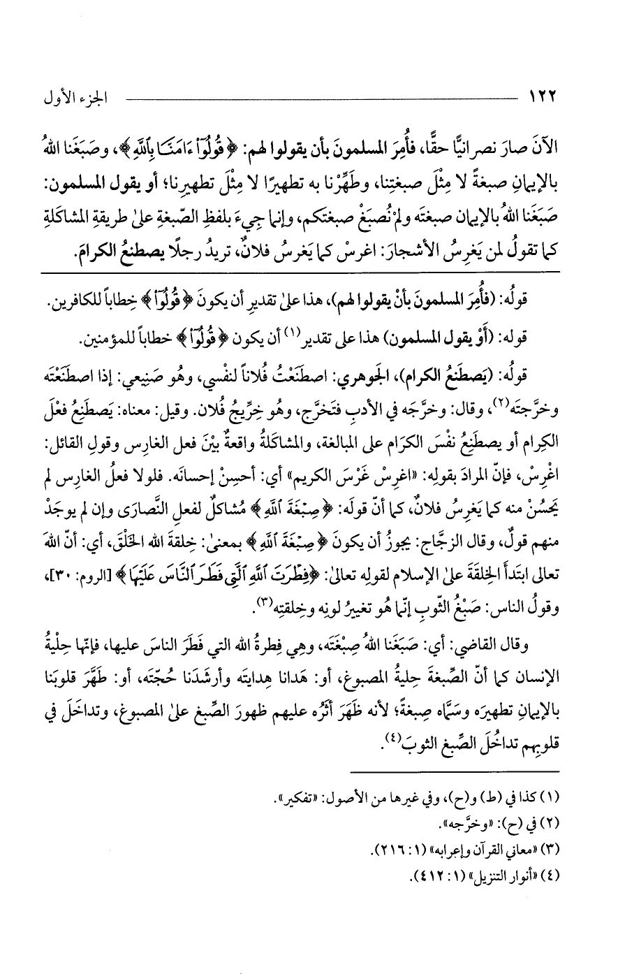 وقال القاضي: أي: صبغنا الله صبغته، وهي فطرة الله التي فطر الناس عليها، فإنها حلية الإنسان كما أن الصبغة حلية المصبوغ، أو: هدانا هدايته وأرشدنا حجته، أو: طهر قلوبنا بالإيمان تطهيره وسماه صبغة؛ لأنه ظهر أثره عليهم ظهور الصبغ على المصبوغ، وتداخل في قلوبهم تداخل الصبغ الثوب.