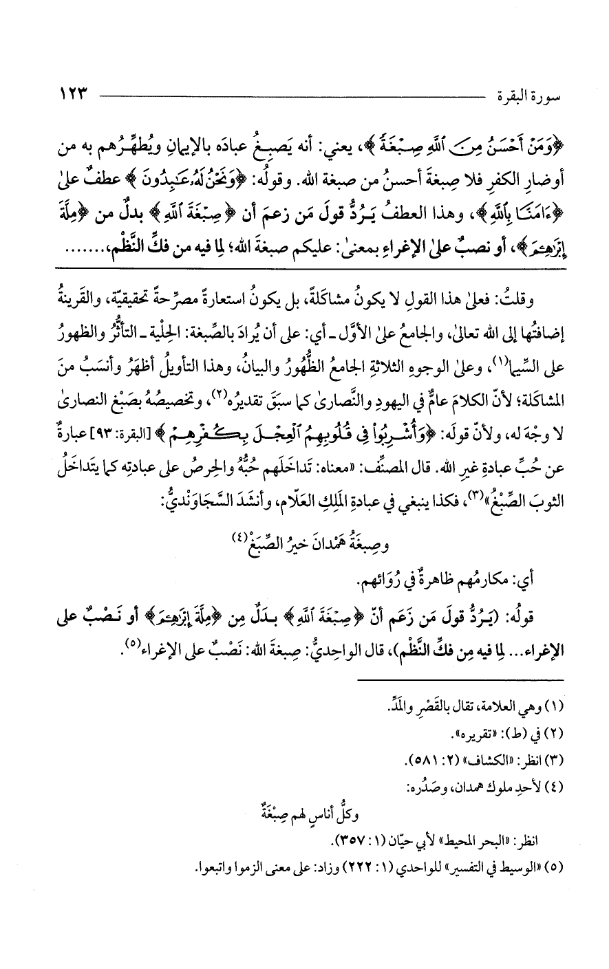قوله: (يرد قول من زعم أن (صِبْغَةَ اللَّهِ) بدل من (مِلَّةَ إِبْرَاهِيمَ) أو نصب على الإغراء ... لما فيه من فك النظم)، قال الواحدي: صبغة الله: نصب على الإغراء.