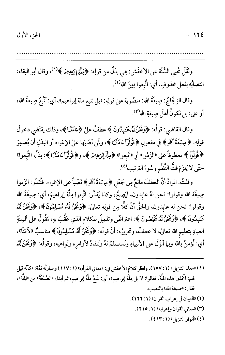 وقال القاضي: قوله: (وَنَحْنُ لَهُ عَابِدُونَ) عطف على (آمَنَّا)، وذلك يقتضي دخول قوله: (صِبْغَةَ اللَّهِ) في مفعول (قُولُوا آمَنَّا)، ولمن نصبها على الإغراء أو البدل أن يضمر (قُولُوا) معطوفاً على "الزموا" أو "اتبعوا" (مِلَّةَ إِبْرَاهِيمَ)، و (قُولُوا آمَنَّا): بدل "اتبعوا" حتى لا يلزم فك النظم وسوء الترتيب.