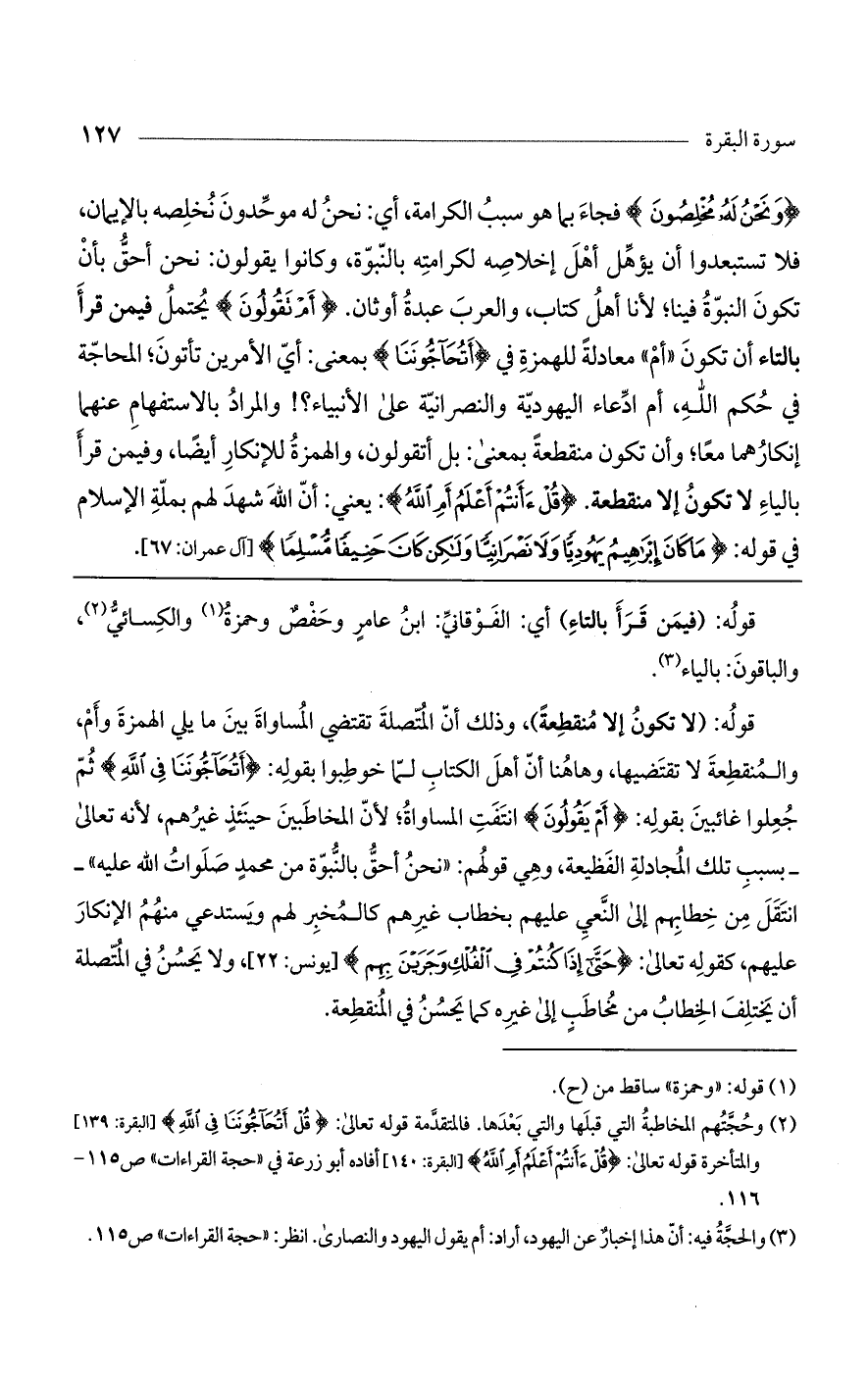 (وَنَحْنُ لَهُ مُخْلِصُونَ) فجاء بما هو سبب الكرامة، أي: نحن له موحدون نخلصه بالإيمان، فلا تستبعدوا أن يؤهل أهل إخلاصه لكرامته بالنبوة، وكانوا يقولون: نحن أحق بأن تكون النبوة فينا؛ لأنا أهل كتاب، والعرب عبدة أوثان. (أَمْ تَقُولُونَ) يحتمل فيمن قرأ بالتاء أن تكون "أم" معادلة للهمزة في (أَتُحَاجُّونَنَا) بمعنى: أي الأمرين تأتون؛ المحاجة في حكم الله، أم ادعاء اليهودية والنصرانية على الأنبياء؟ ! والمراد بالاستفهام عنهما إنكارهما معاً؛ وأن تكون منقطعة بمعنى: بل أتقولون، والهمزة للإنكار أيضاً، وفيمن قرأ بالياء لا تكون إلا منقطعة بمعنى: بل أتقولون، والهمزة للإنكار أيضاً، وفيمن قرأ بالياء لا تكون إلا منقطعة. (قُلْ أَأَنْتُمْ أَعْلَمُ أَمْ اللَّهُ): يعني: أن الله شهد لهم بملة الإسلام في قوله: (مَا كَانَ إِبْرَاهِيمُ يَهُودِيّاً وَلا نَصْرَانِيّاً وَلَكِنْ كَانَ حَنِيفاً مُسْلِماً) [آل عمران: 67]