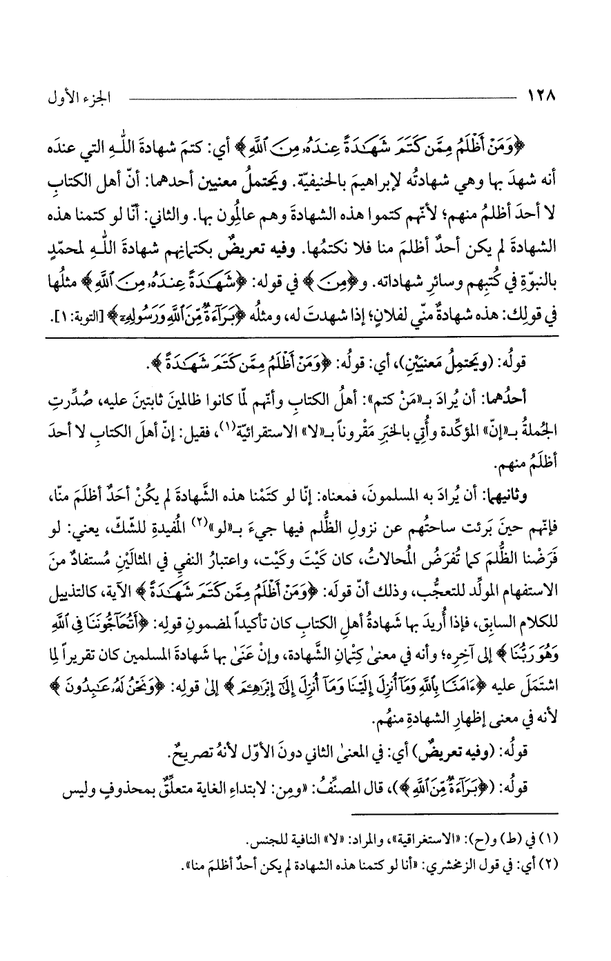 وثانيهما: أن يراد به المسلمون، فمعناه: إنا لو كتمنا هذه الشهادة لم يكن أحد أظلم منا، فإنهم حين برئت ساحتهم عن نزول الظلم فيها جيء بـ "لو" المفيدة للشك، يعني: لو فرضنا الظلم كما تفرض المحالات، كان كَيْتَ وكَيْت، واعتبار النفي في المثالين مستفاد من الاستفهام المولد للتعجب، وذلك أن قوله: (وَمَنْ أَظْلَمُ مِمَّنْ كَتَمَ شَهَادَةً) الآية، كالتذييل للكلام السابق، فإذا أريد بها شهادة أهل الكتاب كان تأكيداً لمضمون قوله: (أَتُحَاجُّونَنَا فِي اللَّهِ وَهُوَ رَبُّنَا) إلى آخره؛ وأنه في معنى كتمان الشهادة، وإن عنى بها شهادة المسلمين كان تقريراً لما اشتمل عليه (آمَنَّا بِاللَّهِ وَمَا أُنزِلَ إِلَيْنَا وَمَا أُنْزِلَ إِلَى إِبْرَاهِيمَ) إلى قوله: (وَنَحْنُ لَهُ عَابِدُونَ) لأنه في معنى إظهار الشهادة منهم.