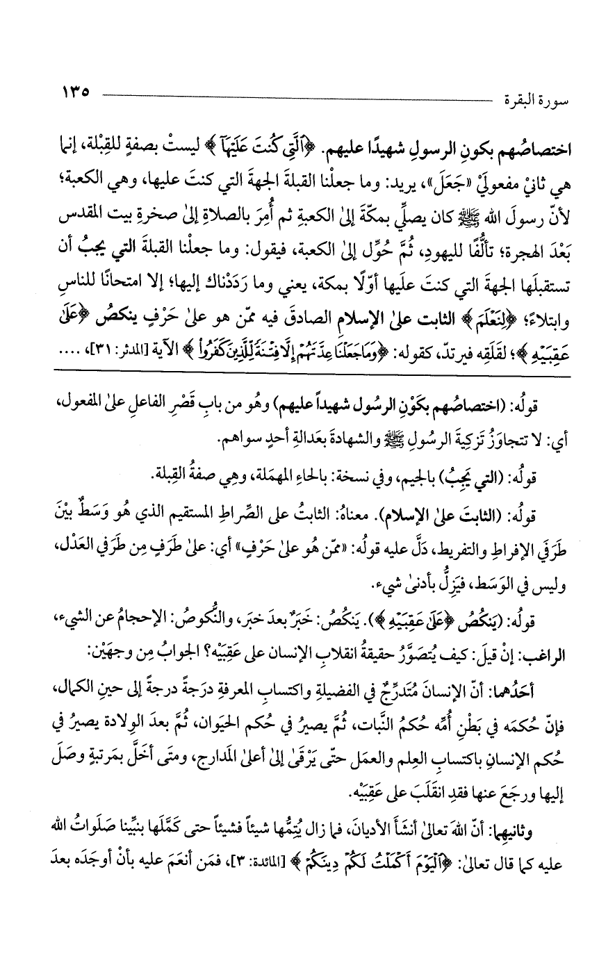 اختصاصهم بكون الرسول شهيداً عليهم. (الَّتِي كُنتَ عَلَيْهَا) ليست بصفة للقِبلة، إنما هي ثاني مفعولي "جعل"، يريد: وما جعلنا القبلة الجهة التي كنت عليها، وهي الكعبة؛ لأن رسول الله صلى الله عليه وسلم كان يصلي بمكة إلى الكعبة ثم أمر بالصلاة إلى صخرة بيت المقدس بعد الهجرة؛ تألفاً لليهود، ثم حول إلى الكعبة، فيقول: وما جعلنا القبلة التي يجب أن تستقبلها الجهة التي كنت عليها أولاً بمكة، يعني وما رددناك إليها؛ إلا امتحاناً للناس وابتلاء؛ (لِنَعْلَمَ) الثابت على الإسلام الصادق فيه ممن هو على حرف ينكص (عَلَى عَقِبَيْهِ)؛ لقلقه فيرتد، كقوله: (وَمَا جَعَلْنَا عِدَّتَهُمْ إِلاَّ فِتْنَةً لِلَّذِينَ كَفَرُوا) الآية [المدثر: 31]،