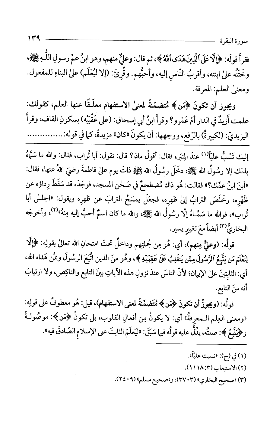 فقرأ قوله: (إِلاَّ عَلَى الَّذِينَ هَدَى اللَّهُ)، ثم قال: وعلي منهم، وهو ابن عم رسول الله صلى الله عليه وسلم، وختنه على ابنته، وأقرب الناس إليه، وأحبهم. وقرئ: (إلا ليعلم) على البناء للمفعول. ومعنى العلم: المعرفة.