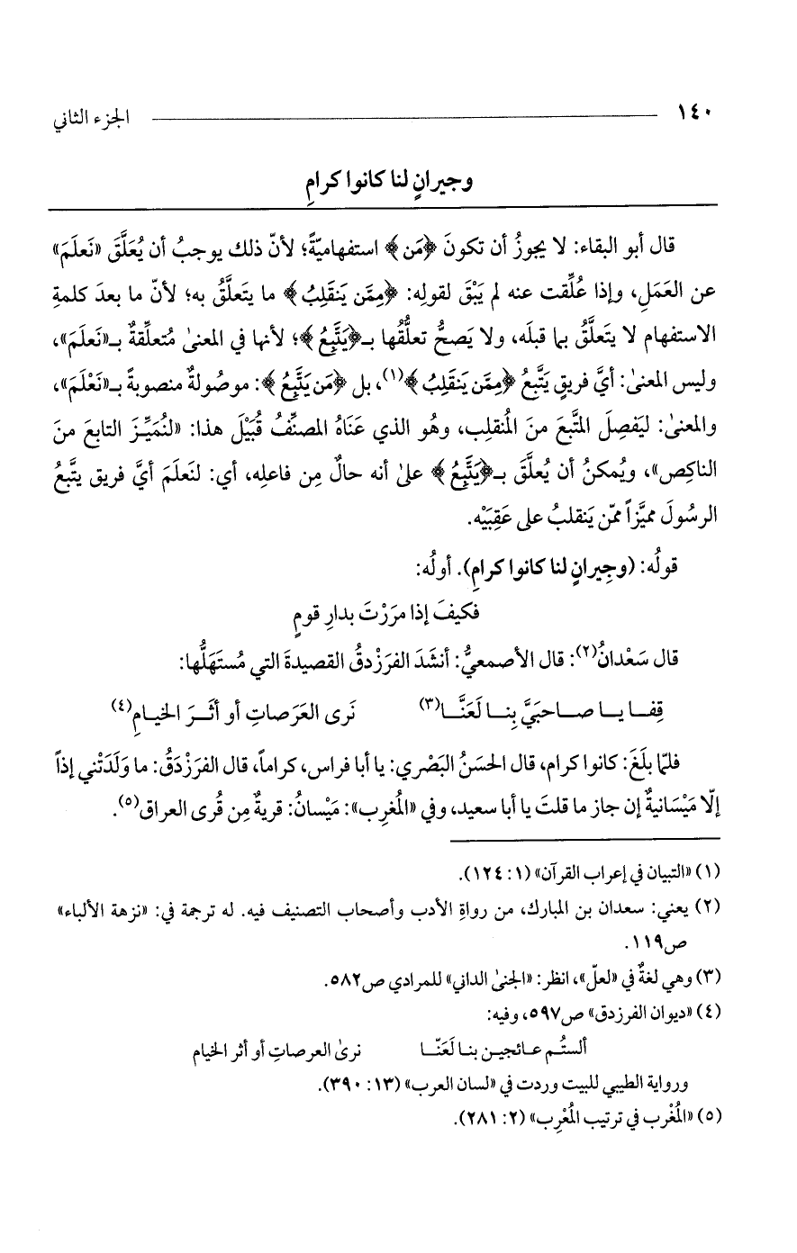 قال أبو البقاء: لا يجوز أن تكون (مَن) استفهامية؛ لأن ذلك يوجب أن يعلق "نعلم" عن العمل، وإذا علقت عنه لم يبق لقوله: (مِمَّنْ يَنقَلِبُ) ما يتعلق به؛ لأن ما بعد كلمة الاستفهام لا يتعلق بما قبله، ولا يصح تعلقها بـ (يَتَّبِعُ)؛ لأنها في المعنى متعلقة بـ "نعلم"، وليس المعنى: أي فريق يتبع (مِمَّنْ يَنقَلِبُ)، بل (مَن يَتَّبِعُ): موصولة منصوبة بـ "نعلم"، والمعنى: ليفصل المتبع من المنقلب، وهو الذي عناه المصنف قبيل هذا: "لنميز التابع من الناكص"، ويمكن أن يعلق بـ (يَتَّبِعُ) على أنه حال من فاعله، أي: لنعلم أي فريق يتبع الرسول مميزاً ممن ينقلب على عقبيه.