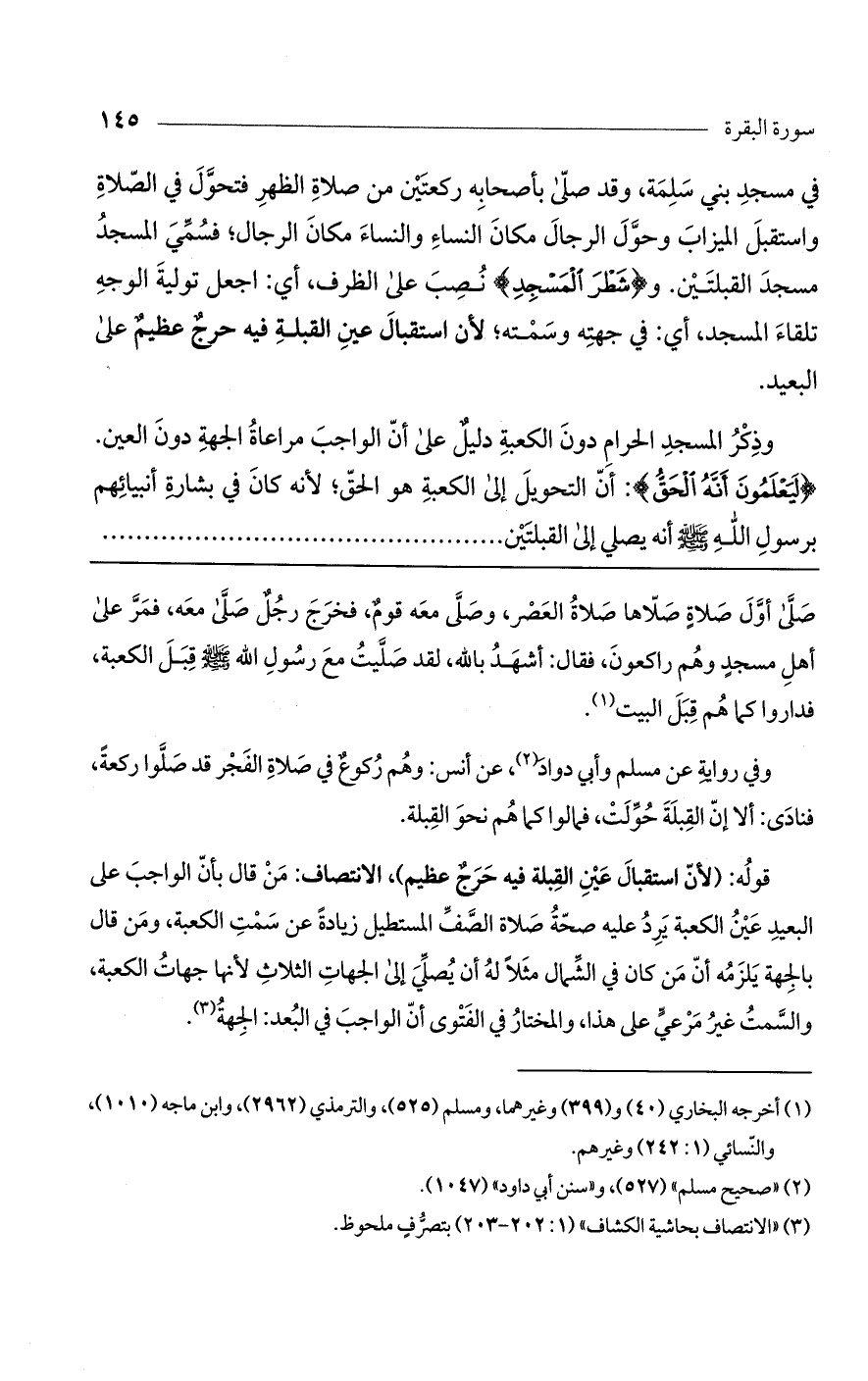 في مسجد بني سلمة، وقد صلى بأصحابه ركعتين من صلاة الظهر فتحول في الصلاة واستقبل الميزاب وحول الرجال مكان النساء والنساء مكان الرجال؛ فسمي المسجد مسجد القبلتين. و (شَطْرَ الْمَسْجِدِ) نصب على الظرف، أي: اجعل تولية الوجه تلقاء المسجد، أي: في جهته وسمته؛ لأن استقبال عين القبلة فيه حرج عظيم على البعيد.