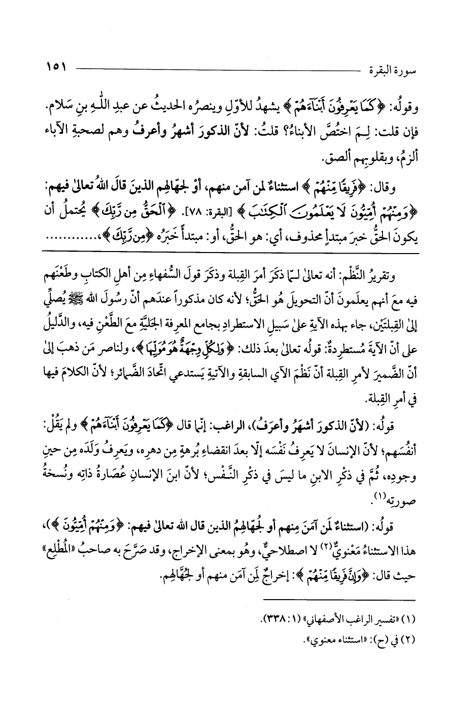 قوله: (استثناء لمن آمن منهم أو لجهالهم الذين قال الله تعالى فيهم: (وَمِنْهُمْ أُمِّيُّونَ))، هذا الاستثناء معنوي لا اصطلاحي، وهو بمعنى الإخراج، وقد صرح به صاحب "المطلع" حيث قال: (وَإِنَّ فَرِيقاً مِنْهُمْ): إخراج لمن آمن منهم أو لجهالهم.