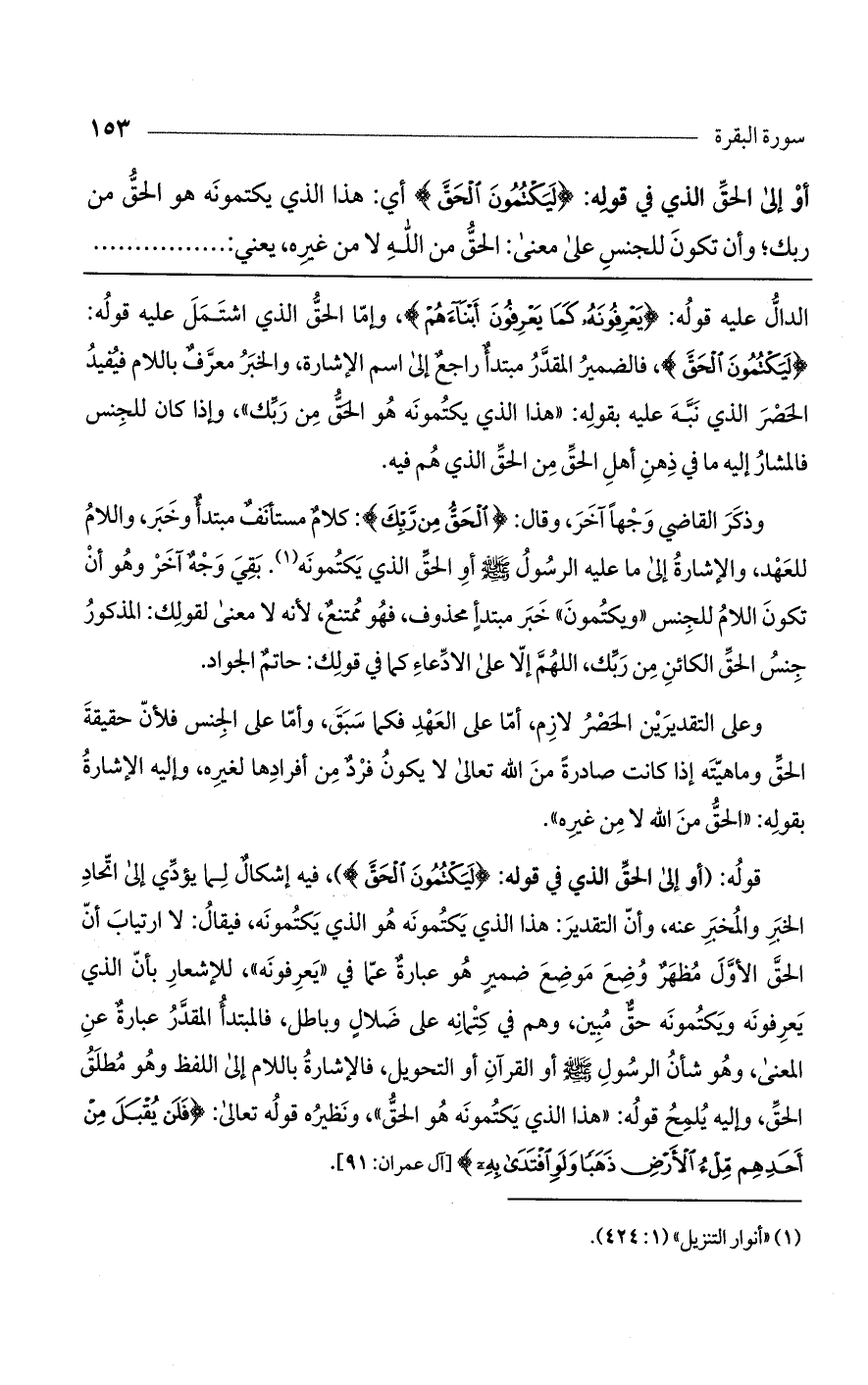 وذكر القاضي وجهاً آخر، وقال: (الْحَقُّ مِنْ رَبِّكَ): كلام مستأنف مبتدأ وخبر، واللام للعهد، والإشارة على ما عليه الرسول صلى الله عليه وسلم أو الحق الذي يكتمونه. بقي وجه آخر وهو أن تكون اللام للجنس "ويكتمون" خبر مبتدأ محذوف، فهو ممتنع، لأنه لا معنى لقولك: المذكور جنس الحق الكائن من ربك، اللهم إلا على الادعاء كما في قولك: حاتم الجواد.
