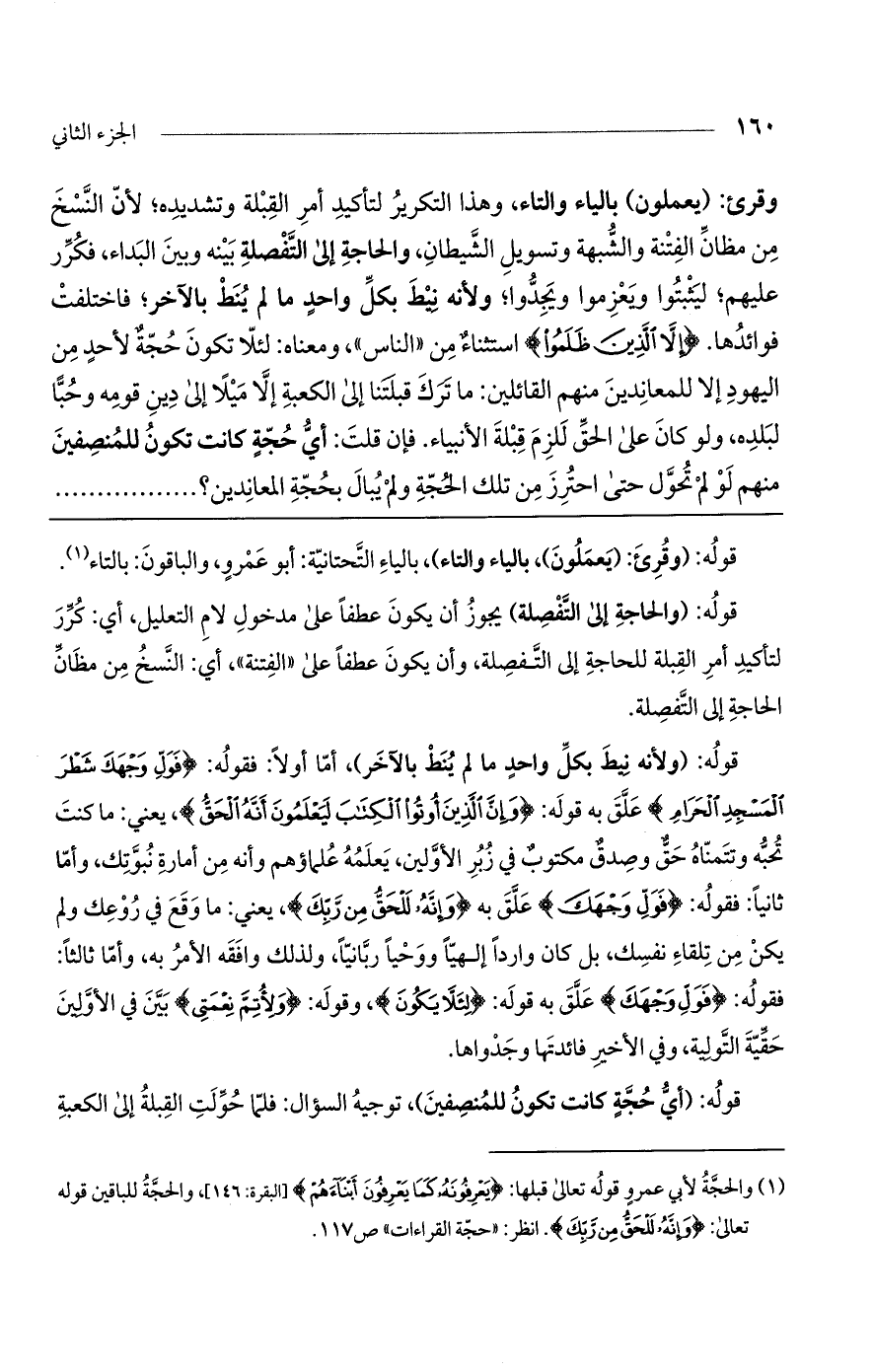 وقرئ: (يعملون) بالياء والتاء، وهذا التكرير لتأكيد أمر القبلة وتشديده؛ لأن النسخ من مظان الفتنة والشبهة وتسويل الشيطان، والحاجة على التفصلة بينه وبين البداء، فكرر عليهم؛ ليثبتوا ويعزموا ويجدوا؛ ولأنه نيط بكل واحد ما لم ينط بالآخر؛ فاختلفت فوائدها. (إِلاَّ الَّذِينَ ظَلَمُوا) استثناء من "الناس"، ومعناه: لئلا تكون حجة لأحد من اليهود إلا للمعاندين منهم القائلين: ما ترك قبلتنا إلى الكعبة إلا ميلاً إلى دين قومه وحباً لبلده، ولو كان على الحق للزم قبلة الأنبياء. فإن قلت: أي حجة كانت تكون للمنصفين منهم لو لم تحول حتى احترز من تلك الحجة ولم يبال بحجة المعاندين؟