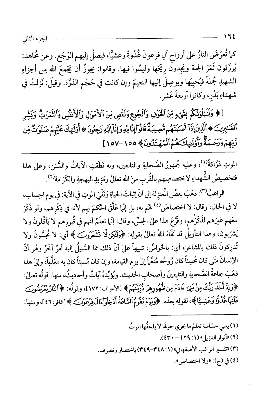 الراغب: ذهب بعض المعتزلة إلى أن إثبات الحياة ونفي الموت في الآية: في يوم الحساب، لا في الحال، وقال: لا اختصاص لهم به، بل إنما علق الحكم بهم لأنه في ذكرهم، ولو ذكر معهم غيرهم لذكرهم، وفرع هذا على الحس، وقال: إنما نعلم أنهم في قبورهم لا يأكلون ولا يشربون، وهذا التأويل قد نفاه الله تعالى بقوله: (وَلَكِنْ لا تَشْعُرُونَ) أي: لا تحسون ولا تدركون ذلك بالمشاعر، أي: بالحواس، تنبيهاً على أن ذلك مما السبيل إليه أمر آخر وهو أن الإنسان متى كان محسناً كان روحه منعماً إلى يوم القيامة، وإن كان مسيئاً كان به معذباً، وإلى هذا ذهب جماعة الصحابة والتابعين وأصحاب الحديث. ويؤيده آيات وأحاديث، منها: قوله تعالى: (وَإِذْ أَخَذَ رَبُّكَ مِنْ بَنِي آدَمَ مِنْ ظُهُورِهِمْ ذُرِّيَّتَهُمْ) [الأعراف: 172]، وقوله: (النَّارُ يُعْرَضُونَ عَلَيْهَا غُدُوّاً وَعَشِيّاً)، لقوله بعده: (وَيَوْمَ تَقُومُ السَّاعَةُ أَدْخِلُوا آلَ فِرْعَوْنَ) [غافر: 46]، ومنها: