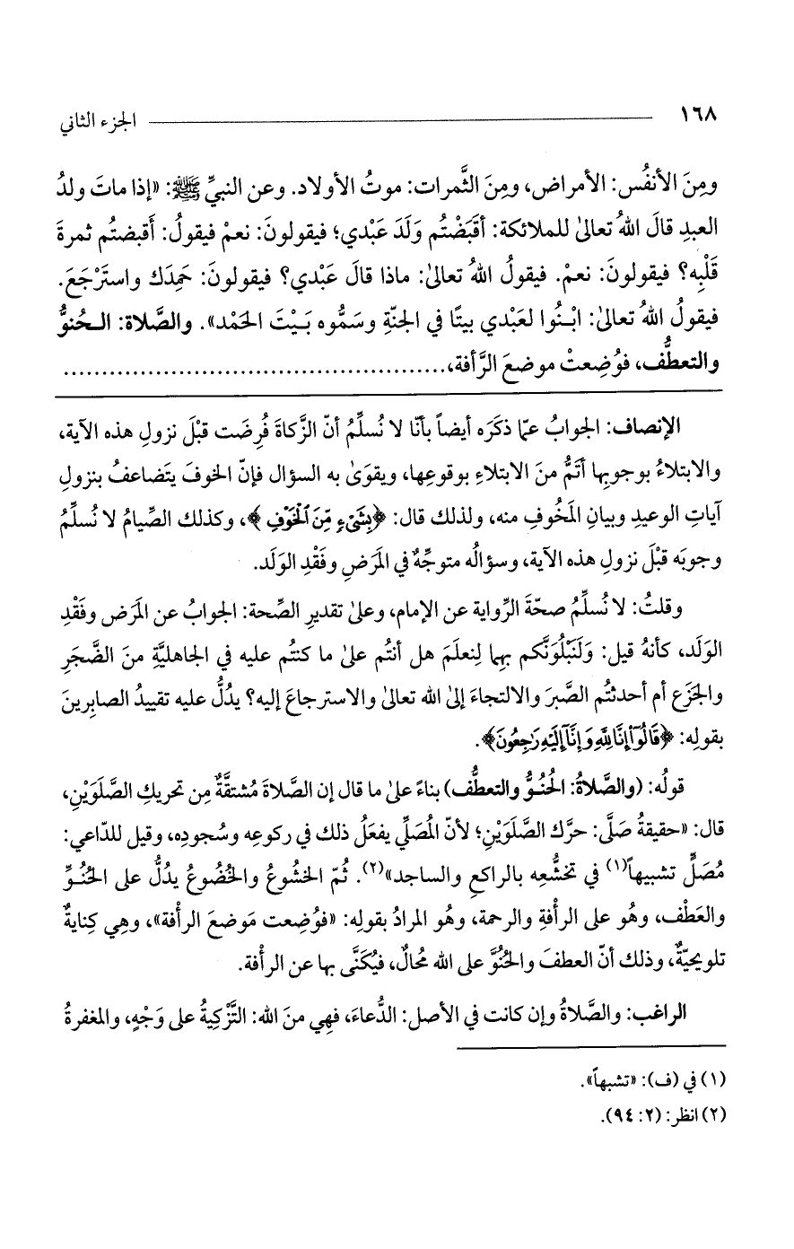 ومن الأنفس: الأمراض، ومن الثمرات: موت الأولاد. وعن النبي صلى الله عليه وسلم: "إذا مات ولد العبد قال الله تعالى للملائكة: أقبضتم ولد عبدي؛ فيقولون: نعم فيقول: أقبضتم ثمرة قلبه؟ فيقولون: نعم. فيقول الله تعالى: ماذا قال عبدي؟ فيقولون: حمدك واسترجع. فيقول الله تعالى: ابنوا لعبدي بيتاً في الجنة وسموه بيت الحمد". والصلاة: الحنو والتعطف، فوضعت موضع الرأفة،