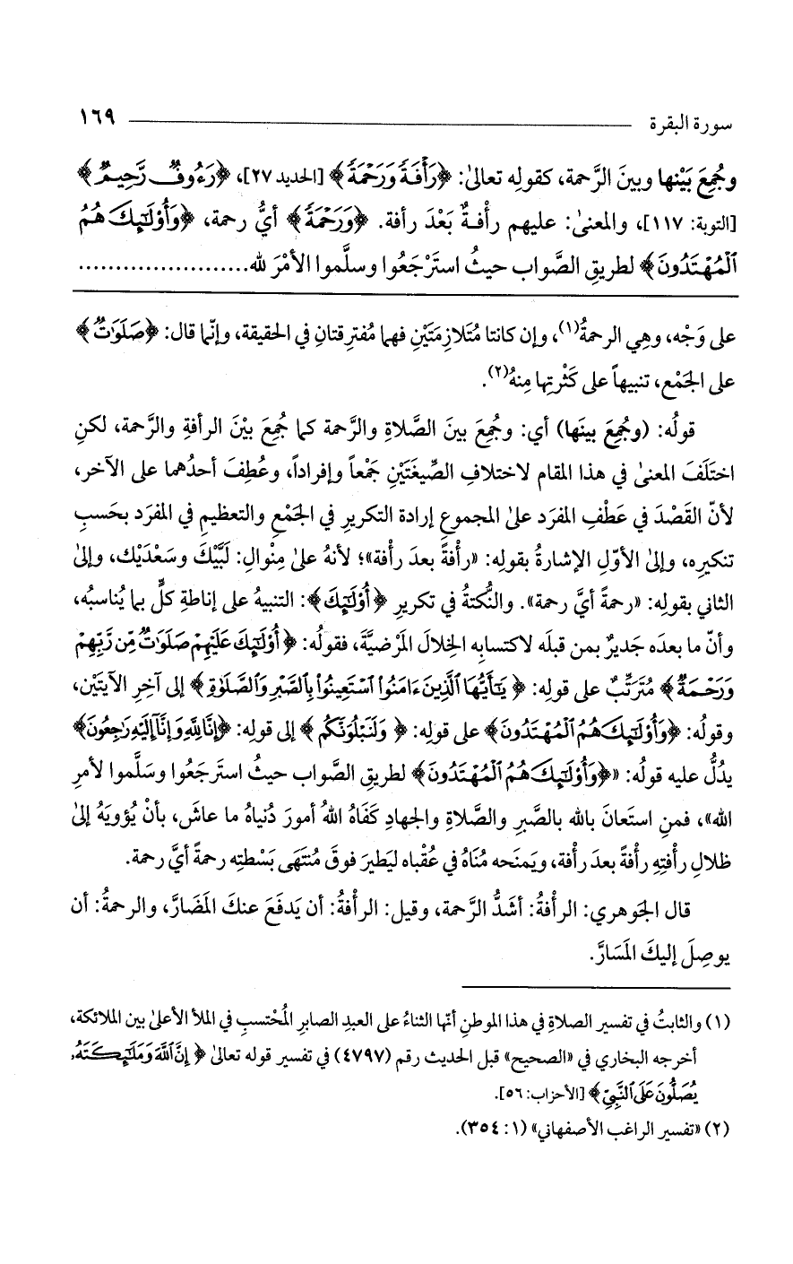 وجمع بينها وبين الرحمة، كقوله تعالى: (رَافَةً وَرَحْمَةً) [الحديد: 27]، (رَءُوفٌ رَحِيمٌ) [التوبة: 117]، والمعنى: عليهم رأفة بعد رأفة. (وَرَحْمَةً) أي رحمة، (وَأُوْلَئِكَ هُمْ الْمُهْتَدُونَ) لطريق الصواب حيث استرجعوا وسلموا الأمر لله