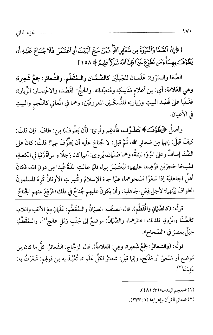 [(إِنَّ الصَّفَا وَالْمَرْوَةَ مِنْ شَعَائِرِ اللَّهِ فَمَنْ حَجَّ الْبَيْتَ أَوْ اعْتَمَرَ فَلا جُنَاحَ عَلَيْهِ أَنْ يَطَّوَّفَ بِهِمَا وَمَنْ تَطَوَّعَ خَيْراً فَإِنَّ اللَّهَ شَاكِرٌ عَلِيمٌ) 158].