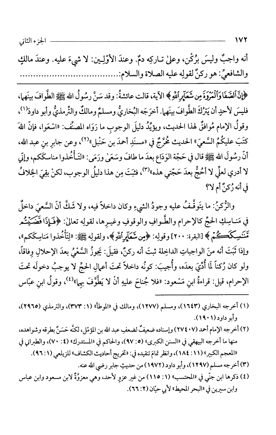 (إِنَّ الصَّفَا وَالْمَرْوَةَ مِنْ شَعَائِرِ اللَّهِ) الآية، قالت عائشة: وقد سن رسول الله صلى الله عليه وسلم الطواف بينهما، فليس لأحد أن يترك الطواف بينهما. أخرجه البخاري ومسلم ومالك والترمذي وأبو داود، وقول الإمام موافق لهذا الحديث، ويؤيد دليل الوجوب ما رواه المصنف: "اسعوا، فإن الله كتب عليكم السعي" الحديث مخرج في "مسند أحمد بن حنبل"، وعن جابر بن عبد الله، أن رسول الله صلى الله عليه وسلم قال في حجة الوداع بعد ما طاف وسعى ورمى: "لتأخذوا مناسككم، وإني لا أدري لعلي لا أحج بعد حجتي هذه"، فثبت من هذا دليل الوجوب، لكن بقي الخلاف في أنه ركن أم لا؟